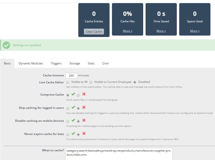 Xalamax Posted May 10, 2016 Share Posted May 10, 2016 Hola: Tengo instalado el módulo Express Caché 2 en versión 2.6.3 y siempre están los indicadores principales a 0. En el Prestashop 1.6.1.4 tengo puesto "Nunca recompilar archivos" y la caché en SI. El servidor es un VPS Parece como si no funcionase. ¿Sabéis qué puede ser? Muchas gracias Link to comment Share on other sites More sharing options...