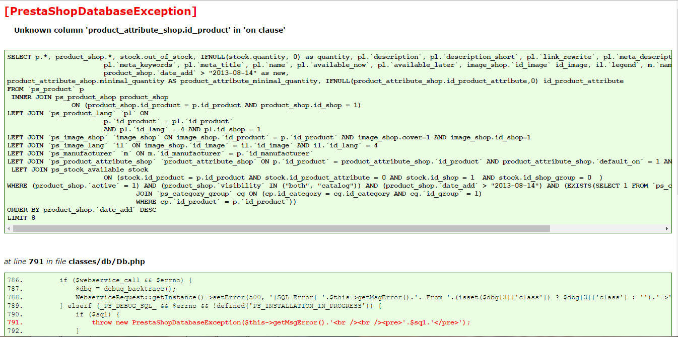 javiersaord Posted May 10, 2016 Share Posted May 10, 2016 (edited) Hello, I have a problem. Products are not displayed in front-end. I click on a category and shows the number of products but shows no product, do not appear. In the back-end , in section of product, showed message Unknown column 'image_shop.id_product' in 'on clause' and in the forum they told me to use the sql ALTER TABLE ps_image_shop ADD `id_product` int(10) unsigned NOT NULL, ADD KEY `id_product` (`id_product`, `id_shop`, `cover`); This fixed the problem but No products appear on pages in the category. I use free template made for Template Monster, I don´t remember the name. My web site is http://www.leslisanchez.com/clientes/eddl and attached files. I put the store in debug mode and this appears (Figure 3) Can you help me? Thanks Edited May 10, 2016 by javiersaord (see edit history) Link to comment Share on other sites More sharing options...