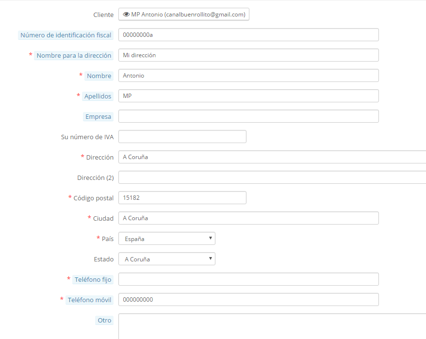 mrpotato10 Posted May 10, 2016 Author Share Posted May 10, 2016 (edited) A simple vista, no veo ningún problema, o lo tengo delante de las narices y no lo veoAdjunto una captura de como tiene configurada la dirección uno de mis clientesPor si vosotros veis algún fallo, que se me paseMuchas gracias.EDITO: Pone España, porque he creado una zona nueva y se la he asignado al país españa y las provincias por si se solucionaba, pero sigue igual Edited May 10, 2016 by mrpotato10 (see edit history) Link to comment Share on other sites More sharing options...