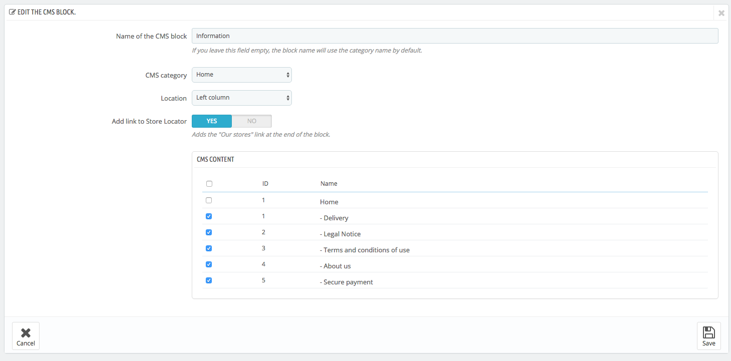 Eagle-eyed Posted May 12, 2016 Share Posted May 12, 2016 Using Prestashop 1.6 and XAMPP 3.2.2 local I'm a newbie and really getting into Prestashop. There is one thing I can't find information about and that is, how to delete "Our Stores" from the sidebar information menu. I have included a picture to be complete. Please help. Thanks Link to comment Share on other sites More sharing options...