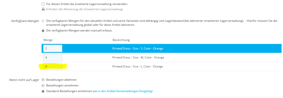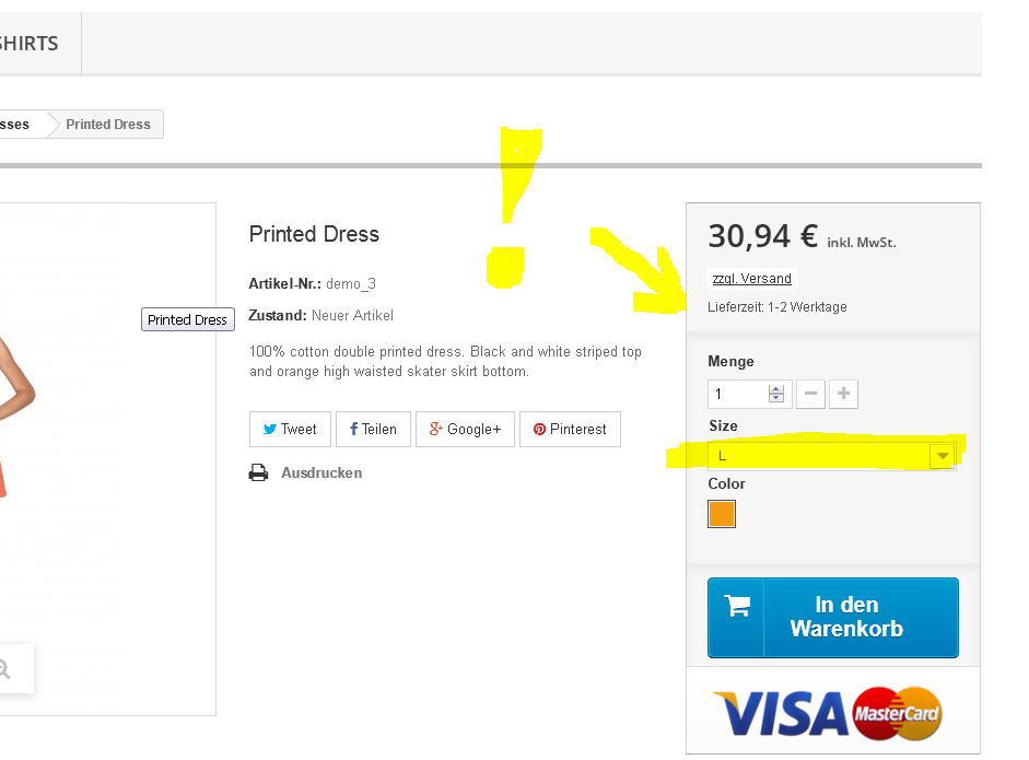 Habe ich nun einen Artikel mit 3 Größen, wobei eine Größe nicht mehr am Lager ist (also Bestand=0) dann tritt der Fehler auf. Wenn ich im Frontend zwischen den Varianten des Artikels umschalte, dann ändert sich nicht die Lieferzeit bei Auswahl einer Variante die nicht am Lager ist. In meinem Fall bleibt die Anzeige der Lieferzeit bei "Lieferzeit: 1-2 Werktage", auch wenn ich eine Variante auswähle deren Bestand 0 ist.