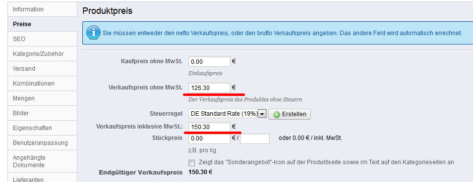 distrax Posted May 19, 2016 Share Posted May 19, 2016 Moin, gibt es eine Möglichkeit, ohne viel Aufwand die Grund- bzw. Stückpreisangabe in Brutto einzugeben? folgendes, zumindest bei 1.5.4.1 muss ich den Grundpreis in Netto angeben. Angenommen ich habe 10 ml Wasser für 4,50€ - entspricht 100ml 45€ Ich muss dann in PS einen Grundpreis von 37,815 € eintragen. Würde auch nicht weiter stören. ABER: Jedes mal wenn ich irgendetwas in diesem Produkt ändere (auch mit dem Manager), zB. die Menge, rundet Prestashop den Nettopreis auf oder ab. So wird aus den 37,815€ dann 37,81€ oder 37,82€, je nach Einstellung. Dies hat aber natürlich Auswirkung auf den im Shop angezeigten Bruttopreis, der dann zB. aufgerundet auf 45,01 € steigt. Eine direkte Eingabe des Bruttopreises würde da schon helfen. Und ja, ich habe gegoogelt, aber außer "wie funktioniert das" und "Grundpreis und Kombinationen" habe ich nichts gefunden. Danke schon einmal. Christian alias distrax Link to comment Share on other sites More sharing options...