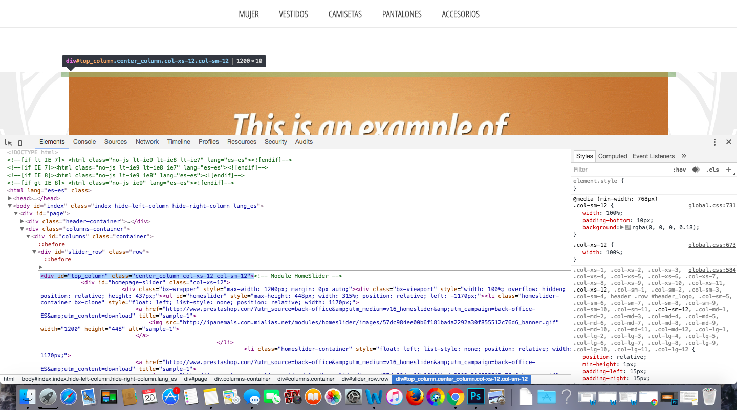 jllramos Posted May 20, 2016 Share Posted May 20, 2016 a ver si me explico mejor chicos lo que quiero es quitar es el sombreado que se queda entre el slider y el menú y para quitar eso tengo que quitar esa línea, pero no consigo localizarla.. si alguien sabe otra forma de poder quitar eso, pues se lo agradecere mucho Danos una muestra del código ó el enlace a la página para poder verlo. En la primera imagen tienes seleccionado el div...top_column entero y ahí no se puede sacar nada en claro, a no ser que quieras eliminar el top column que como puse antes está en header.tpl ¿Te gustaría poner en tu tienda un enlace para que tus clientes soliciten información de producto de forma cómoda? <- Este módulo puede ayudarte a transformar visitantes en clientes -> Link to comment Share on other sites More sharing options...