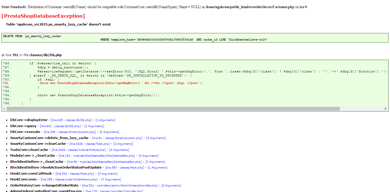Kwash Posted May 21, 2016 Share Posted May 21, 2016 Hi Guys, I am having problems with this error which keeps showing up on my prestashop.I have also attached the picture please help guys. Can someone assist me with the script I have to run to restore the database tablet correctly,also I am not sure if this also has to do with my host please help in deep trouble. [PrestaShopDatabaseException]Table 'ngahcom_vic2015.ps_smarty_lazy_cache' doesn't exist SELECT UNIX_TIMESTAMP(last_update) as last_update, filepath FROM `ps_smarty_lazy_cache` WHERE `template_hash`='a46fdbfdb7978bc10fca01be27f9a288' AND cache_id="" AND compile_id="" LIMIT 1 at line 791 in file classes/db/Db.php 786. if ($webservice_call && $errno) { 787. $dbg = debug_backtrace();788. WebserviceRequest::getInstance()->setError(500, ' '.$this->getMsgError().'. From '.(isset($dbg[3]['class']) ? $dbg[3]['class'] : '').'->'.$dbg[3]['function'].'() Query was : '.$sql, 97);789. } elseif (_PS_DEBUG_SQL_ && $errno && !defined('PS_INSTALLATION_IN_PROGRESS')) {790. if ($sql) {791. throw new PrestaShopDatabaseException($this->getMsgError().'<br /><br /><pre>'.$sql.'</pre>');792. }793.794. throw new PrestaShopDatabaseException($this->getMsgError());795. }796. } DbCore->displayError - [line 425 - classes/db/Db.php] - [1 Arguments] DbCore->query - [line 690 - classes/db/Db.php] - [1 Arguments] DbCore->getRow - [line 215 - classes/SmartyCustom.php] - [2 Arguments] SmartyCustomCore->is_in_lazy_cache - [line 153 - classes/SmartyCustom.php] - [3 Arguments] SmartyCustomCore->check_template_invalidation - [line 120 - classes/SmartyCustom.php] - [3 Arguments] SmartyCustomCore->createTemplate - [line 101 - classes/helper/Helper.php] - [2 Arguments] HelperCore->createTemplate - [line 63 - classes/helper/HelperShop.php] - [1 Arguments] HelperShopCore->getRenderedShopList - [line 1912 - classes/controller/AdminController.php] AdminControllerCore->initHeader - [line 185 - classes/controller/Controller.php] ControllerCore->run - [line 367 - classes/Dispatcher.php] DispatcherCore->dispatch - [line 58 - admin/index.php] Please assist guys I am now just lost. Link to comment Share on other sites More sharing options...