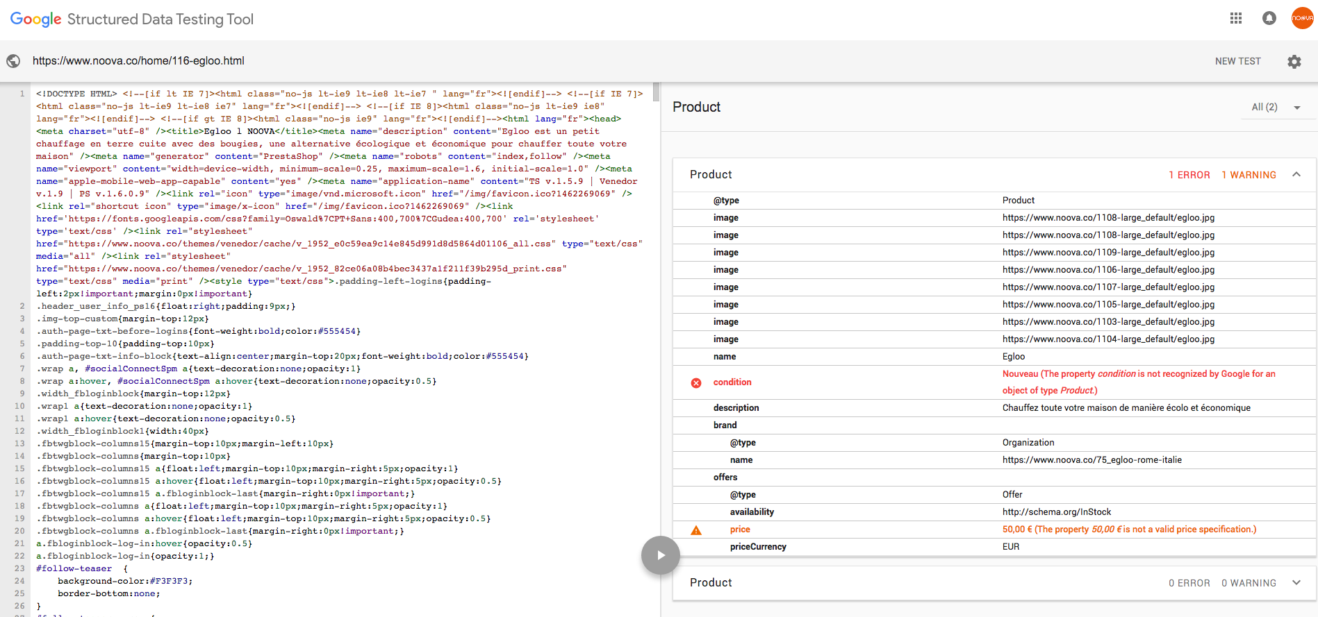 p.guerin Posted May 25, 2016 Share Posted May 25, 2016 Hello la communauté, J'espère que je poste au bon endroit. J'ai installé le module d'avis Yotpo sur ma boutique (www.noova.co), mais Google Structured Data Testing Tool signale des erreurs sur le référencement des produits au niveau de la devise et de la condition "nouveau", voir le screenshot en PJ Quelqu'un a déjà eu ce pb ? savez vous comment le solutionner ? Vous pouvez voir le souci avec ce lien: https://search.google.com/structured-data/testing-tool?hl=en&url=https://www.noova.co/home/116-egloo.html#url=https%3A%2F%2Fwww.noova.co%2Fhome%2F116-egloo.html Merci ! Pierre Link to comment Share on other sites More sharing options...