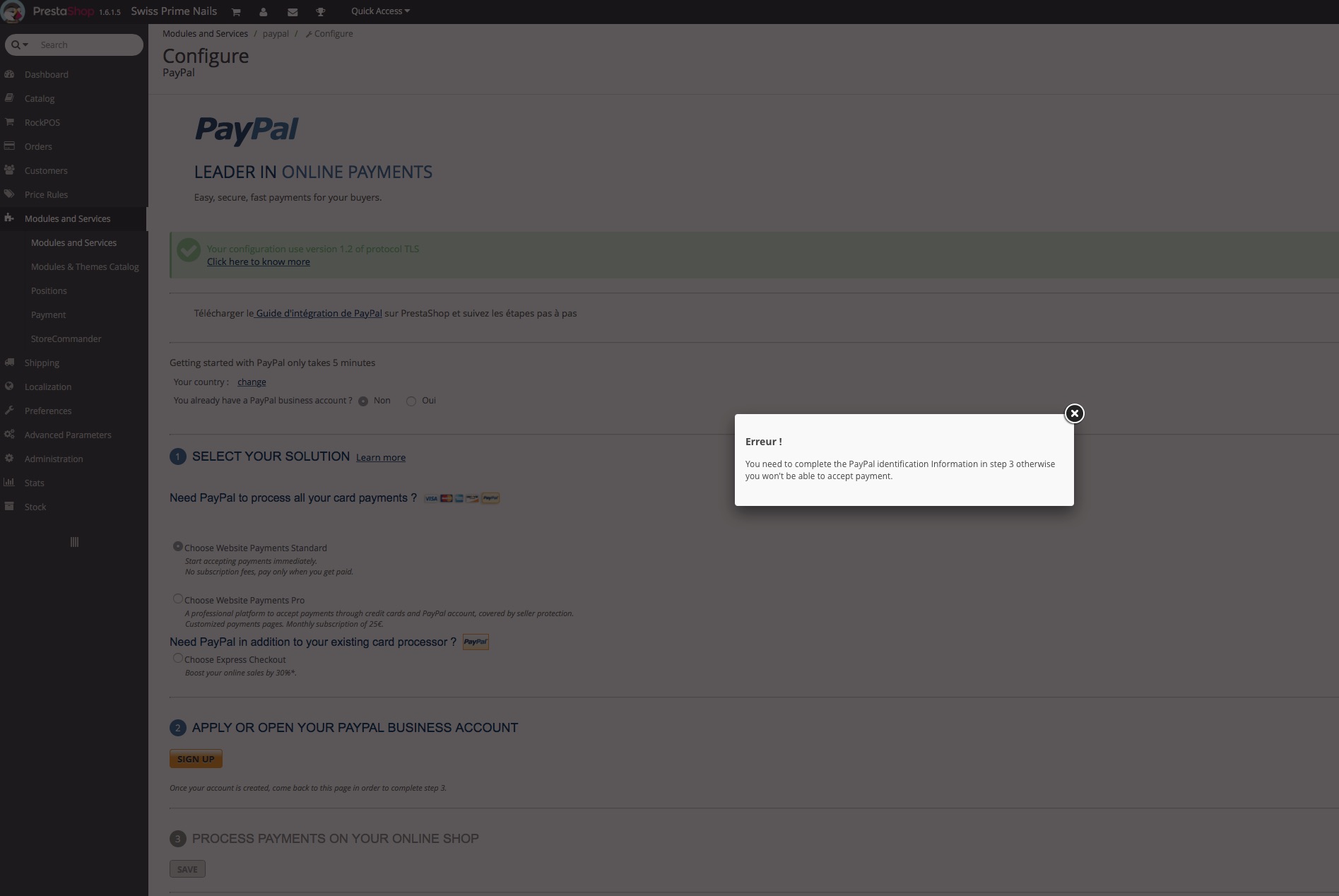 WEMS Posted May 25, 2016 Share Posted May 25, 2016 The "Official Paypal" module is installed and the module s up to date. Every-time when I save the Paypal identification info, I get the following pop error message and the identification info disappear. Erreur !You need to complete the PayPal identification Information in step 3 otherwise you won't be able to accept payment. Link to comment Share on other sites More sharing options...