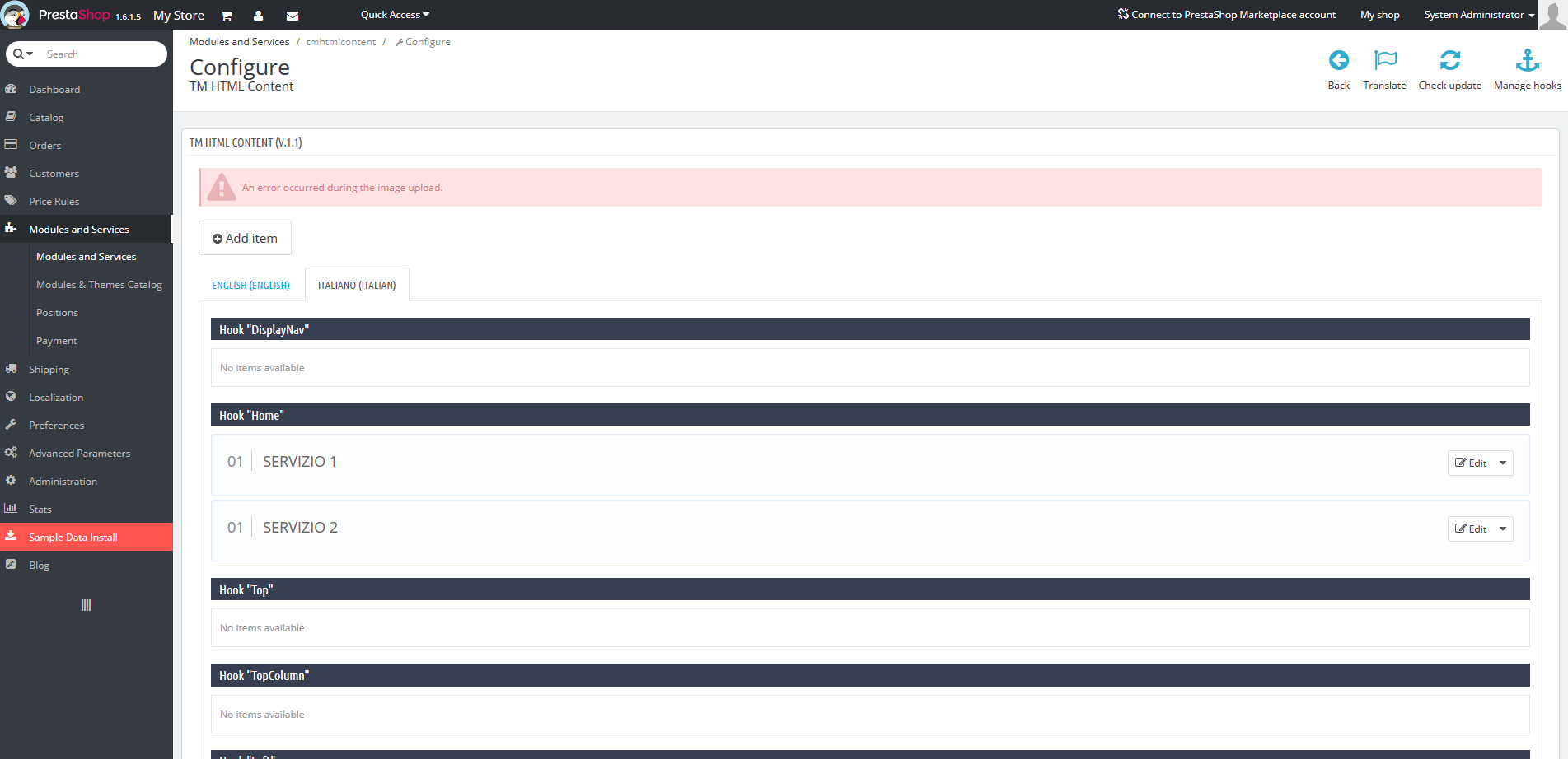 pupito Posted May 29, 2016 Share Posted May 29, 2016 Ciao, sto cercando di studiare Prestashop. Ho installato versione 1.6.1.5. Stavo provando a caricare una immagine per il modulo HTML ma da errore. I permessi delle cartelle sono 755. Avete riscontrato questo problema anche voi? Grazie Link to comment Share on other sites More sharing options...