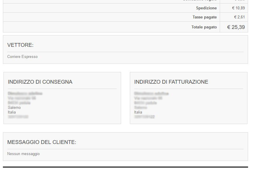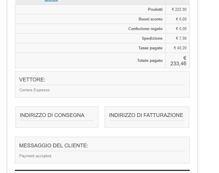gico2003 Posted May 29, 2016 Share Posted May 29, 2016 Ciao a tutti. Ho due shop entrambi su ver 1.6.1.4. Su uno dei due, che ho da poco avviato ho un problema che sull'altro non ho. Vi spiego. Nel backoffice, nella scheda di un ordine, nel box degli indirizzi non mi vengono visualizzati i dati degli indirizzi bensì le note dell'ordine (se ce ne sono). VISUALIZZAZIONE ERRATA VISUALIZZAZIONE CORRETTA Stesso discorso mi succede nelle mail di conferma ordine che il cliente riceve. Niente indirizzi visualizzati e nelel note del cliente mi viene fuori l'esito del pagamento. VISUALIZZAZIONE ERRATA VISUALIZZAZIONE CORRETTA Io credo che la cosa sia collegata e che quasi sicuramente si tratti di qualcosa nelle tabelle del DB. Chi mi saprebbe dire quale potrebbe essere il problema ? Vi iringarzio in anticipo. Saluti Link to comment Share on other sites More sharing options...