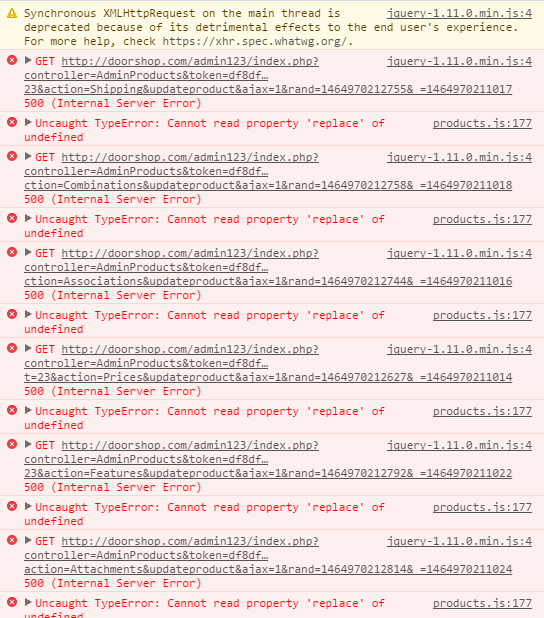 carinac Posted June 1, 2016 Author Share Posted June 1, 2016 jquery-1.11.0.min.js:4 GET http://doorshop.com/admin123/index.php?controller=AdminProducts&token=df8df…ion=VirtualProduct&updateproduct&ajax=1&rand=1464803205587&_=1464803203794 500 (Internal Server Error)send @ jquery-1.11.0.min.js:4n.extend.ajax @ jquery-1.11.0.min.js:4ProductTabsManager.display @ products.js:117ProductTabsManager.displayBulk @ products.js:166(anonymous function) @ products.js:208 products.js:177 Uncaught TypeError: Cannot read property 'replace' of undefined(anonymous function) @ products.js:177j @ jquery-1.11.0.min.js:2k.fireWith @ jquery-1.11.0.min.js:2x @ jquery-1.11.0.min.js:4b @ jquery-1.11.0.min.js:4jquery-1.11.0.min.js:4 GET http://doorshop.com/admin123/index.php?controller=AdminProducts&token=df8df…&action=Quantities&updateproduct&ajax=1&rand=1464803205582&_=1464803203793 500 (Internal Server Error)send @ jquery-1.11.0.min.js:4n.extend.ajax @ jquery-1.11.0.min.js:4ProductTabsManager.display @ products.js:117ProductTabsManager.displayBulk @ products.js:166(anonymous function) @ products.js:208 GET http://doorshop.com/admin123/index.php?controller=AdminProducts&token=df8df…&action=Quantities&updateproduct&ajax=1&rand=1464803205582&_=1464803203793 500 (Internal Server Error)send @ jquery-1.11.0.min.js:4n.extend.ajax @ jquery-1.11.0.min.js:4ProductTabsManager.display @ products.js:117ProductTabsManager.displayBulk @ products.js:166(anonymous function) @ products.js:208products.js:177 Uncaught TypeError: Cannot read property 'replace' of undefined(anonymous function) @ products.js:177j @ jquery-1.11.0.min.js:2k.fireWith @ jquery-1.11.0.min.js:2x @ jquery-1.11.0.min.js:4b @ jquery-1.11.0.min.js:4 products.js:177 Uncaught TypeError: Cannot read property 'replace' of undefined(anonymous function) @ products.js:177j @ jquery-1.11.0.min.js:2k.fireWith @ jquery-1.11.0.min.js:2x @ jquery-1.11.0.min.js:4b @ jquery-1.11.0.min.js:4jquery-1.11.0.min.js:4 GET http://doorshop.com/admin123/index.php?controller=AdminProducts&token=df8df…t=26&action=Images&updateproduct&ajax=1&rand=1464803205594&_=1464803203795 500 (Internal Server Error)send @ jquery-1.11.0.min.js:4n.extend.ajax @ jquery-1.11.0.min.js:4ProductTabsManager.display @ products.js:117ProductTabsManager.displayBulk @ products.js:166(anonymous function) @ products.js:208 jquery-1.11.0.min.js:4 GET http://doorshop.com/admin123/index.php?controller=AdminProducts&token=df8df…t=26&action=Images&updateproduct&ajax=1&rand=1464803205594&_=1464803203795 500 (Internal Server Error)send @ jquery-1.11.0.min.js:4n.extend.ajax @ jquery-1.11.0.min.js:4ProductTabsManager.display @ products.js:117ProductTabsManager.displayBulk @ products.js:166(anonymous function) @ products.js:208 products.js:177 Uncaught TypeError: Cannot read property 'replace' of undefined(anonymous function) @ products.js:177j @ jquery-1.11.0.min.js:2k.fireWith @ jquery-1.11.0.min.js:2x @ jquery-1.11.0.min.js:4b @ jquery-1.11.0.min.js:4jquery-1.11.0.min.js:4 GET http://doorshop.com/admin123/index.php?controller=AdminProducts&token=df8df…26&action=Features&updateproduct&ajax=1&rand=1464803205598&_=1464803203796 500 (Internal Server Error)send @ jquery-1.11.0.min.js:4n.extend.ajax @ jquery-1.11.0.min.js:4ProductTabsManager.display @ products.js:117ProductTabsManager.displayBulk @ products.js:166(anonymous function) @ products.js:208 jquery-1.11.0.min.js:4 GET http://doorshop.com/admin123/index.php?controller=AdminProducts&token=df8df…26&action=Features&updateproduct&ajax=1&rand=1464803205598&_=1464803203796 500 (Internal Server Error)send @ jquery-1.11.0.min.js:4n.extend.ajax @ jquery-1.11.0.min.js:4ProductTabsManager.display @ products.js:117ProductTabsManager.displayBulk @ products.js:166(anonymous function) @ products.js:208products.js:177 Uncaught TypeError: Cannot read property 'replace' of undefined(anonymous function) @ products.js:177j @ jquery-1.11.0.min.js:2k.fireWith @ jquery-1.11.0.min.js:2x @ jquery-1.11.0.min.js:4b @ jquery-1.11.0.min.js:4 Uncaught TypeError: Cannot read property 'replace' of undefined(anonymous function) @ products.js:177j @ jquery-1.11.0.min.js:2k.fireWith @ jquery-1.11.0.min.js:2x @ jquery-1.11.0.min.js:4b @ jquery-1.11.0.min.js:4 Link to comment Share on other sites More sharing options...