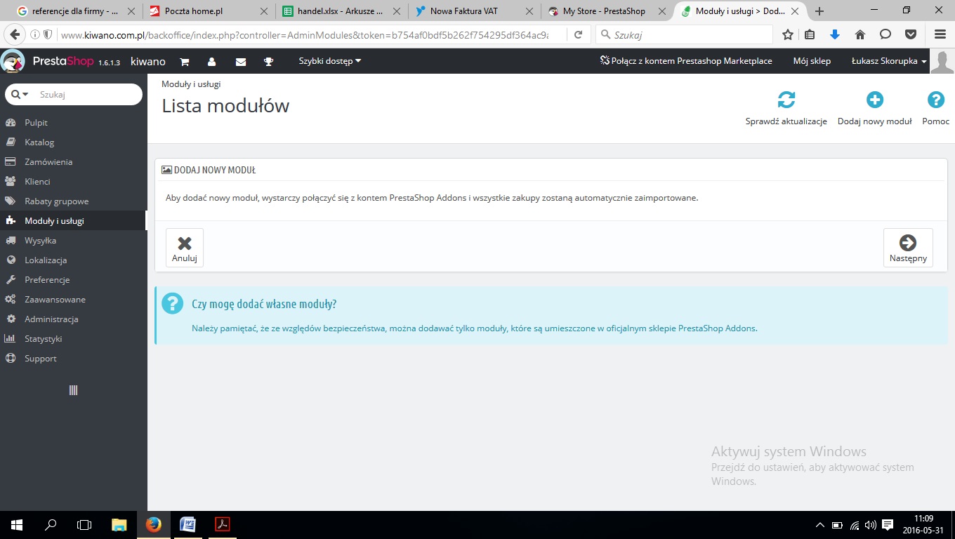 W związku z tym nie jesteśmy w stanie pomóc, prawdopodobnie posiadają Państwo zmodyfikowaną bądź ograniczoną wersję sklepu, która uniemożliwia instalacji zewnętrznych modułów."