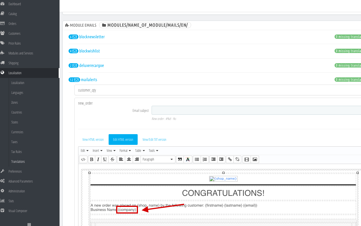 canelones Posted June 2, 2016 Share Posted June 2, 2016 Prestashop 1.6 I enabled the B2B feature to allow the costumer to enter his Company Name. It works fine. Now I need to show that "Company Name" in the "new order" email that the administrator receives when a new order is created. What I have done do so far: 1 - In Localization/Translation/Email templates for my theme I edited the "new order" email and add the variable (token): {company} See the capture. 2- In Localization/Countries I edited the only enabled country (which is Spain) to add 'company' to Address format. See the capture. Problem is that the email shows the text {company} instead of its value. e.x: Acme, Apple... What am I missing here? Link to comment Share on other sites More sharing options...