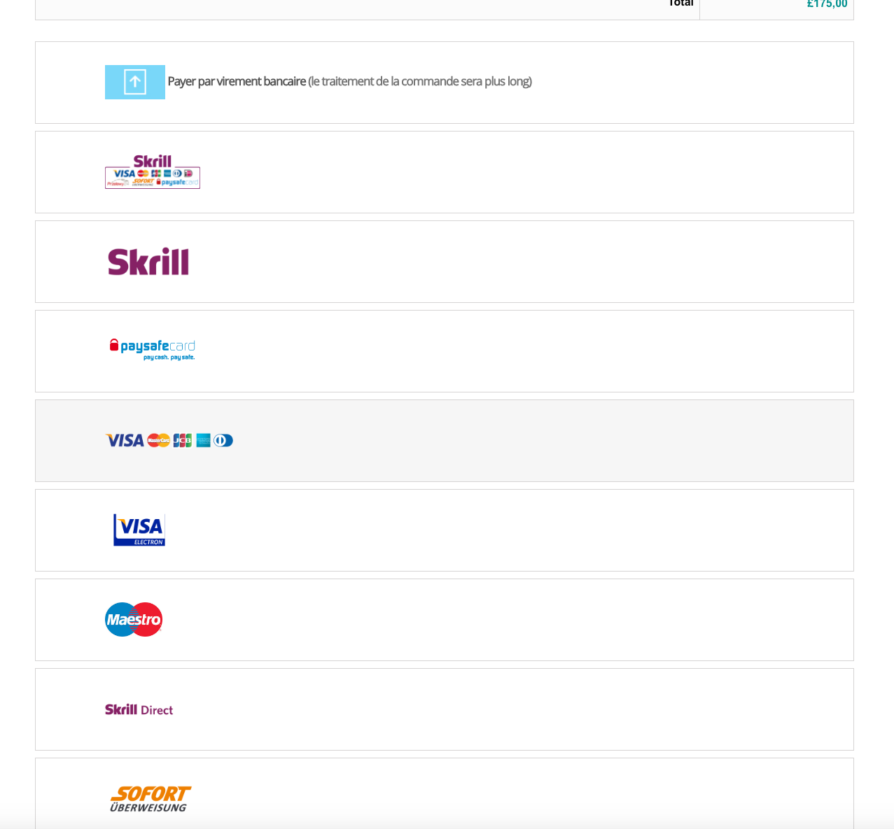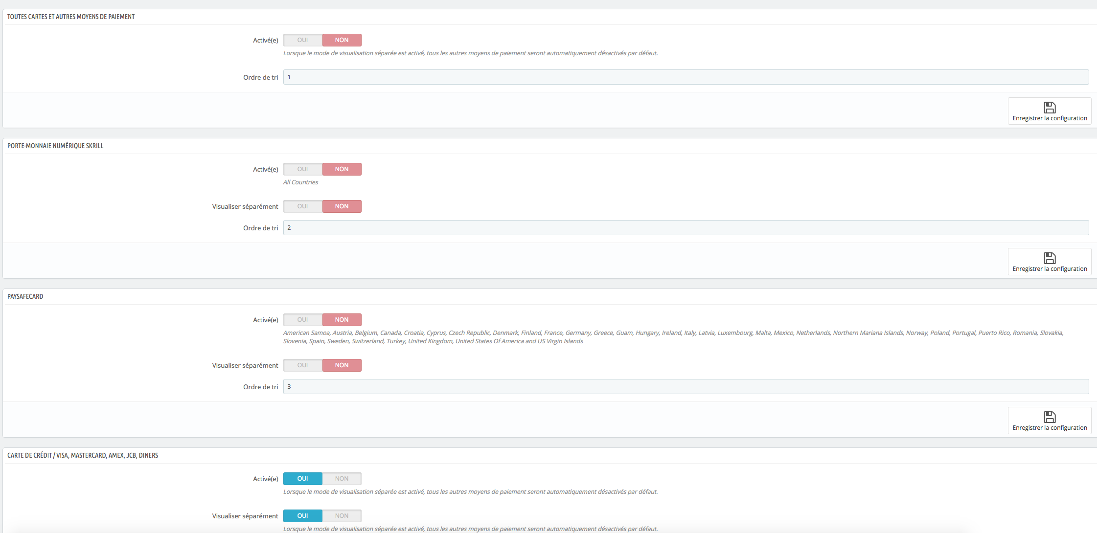 FloreG Posted June 3, 2016 Share Posted June 3, 2016 (edited) Hi, I just install Skrill on my shop. I disable all payment system expect the basic debit card as visa master card.... I don't want the 'PaySafe' appears in the choice for instance. However, even if I disable all of them, they are still appearing and as you can see the list is still super long. I just want on choice. How can I fix that? Moreover, if I save the configuration and close the module, when I come bakc on it, all the payment system are enable again... Thanks, Edited June 3, 2016 by FloreG (see edit history) Link to comment Share on other sites More sharing options...