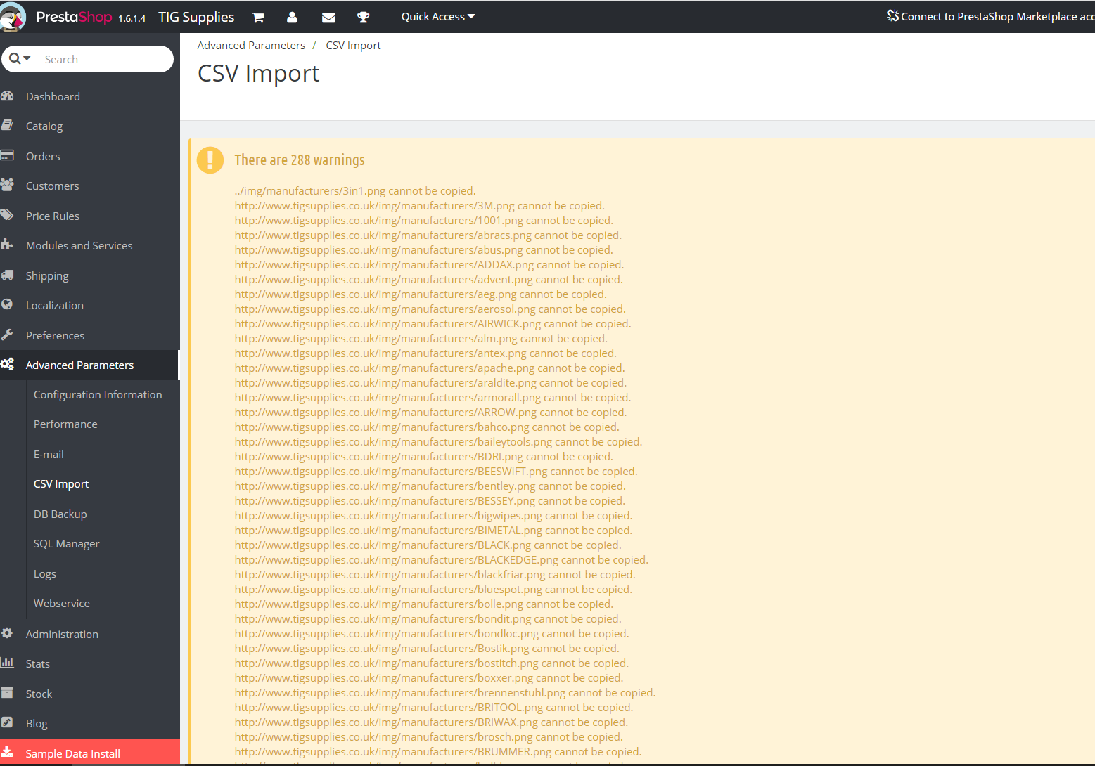 tigsupplies Posted June 3, 2016 Share Posted June 3, 2016 I am importing a CSV of manufacturers into PS. I have the URL for the image as specified, the entire absolute URL. However when I try to import it, it works but I get the attached warnings: http://www.tigsupplies.co.uk/img/manufacturers/3M.png cannot be copied. This happens for all of the records. I have looked around the web and found nothing. Any help would be amazing! Link to comment Share on other sites More sharing options...