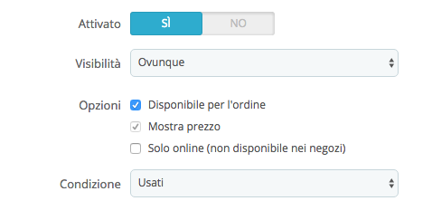 indolestudio Posted June 3, 2016 Share Posted June 3, 2016 Salve, qualcuno di voi si è mai imbattuto in questa modifica?Dovrei cambiare le voci nel BO quando, fase di inserimento prodotto, vado a scegliere dal menù a tendina le varie condizioni: NUOVO/USATO/... Ho modificato le voci sul file product.tpl, infatti nel Front i testi escono come devono uscire, ma nel menù a tendina non riesco a modificare o ad aggiungere altre voci. La richiesta è del mio Cliente, inutilmente persuaso a lasciar stare. Qualcuno può darmi una dritta? Grazie. Link to comment Share on other sites More sharing options...