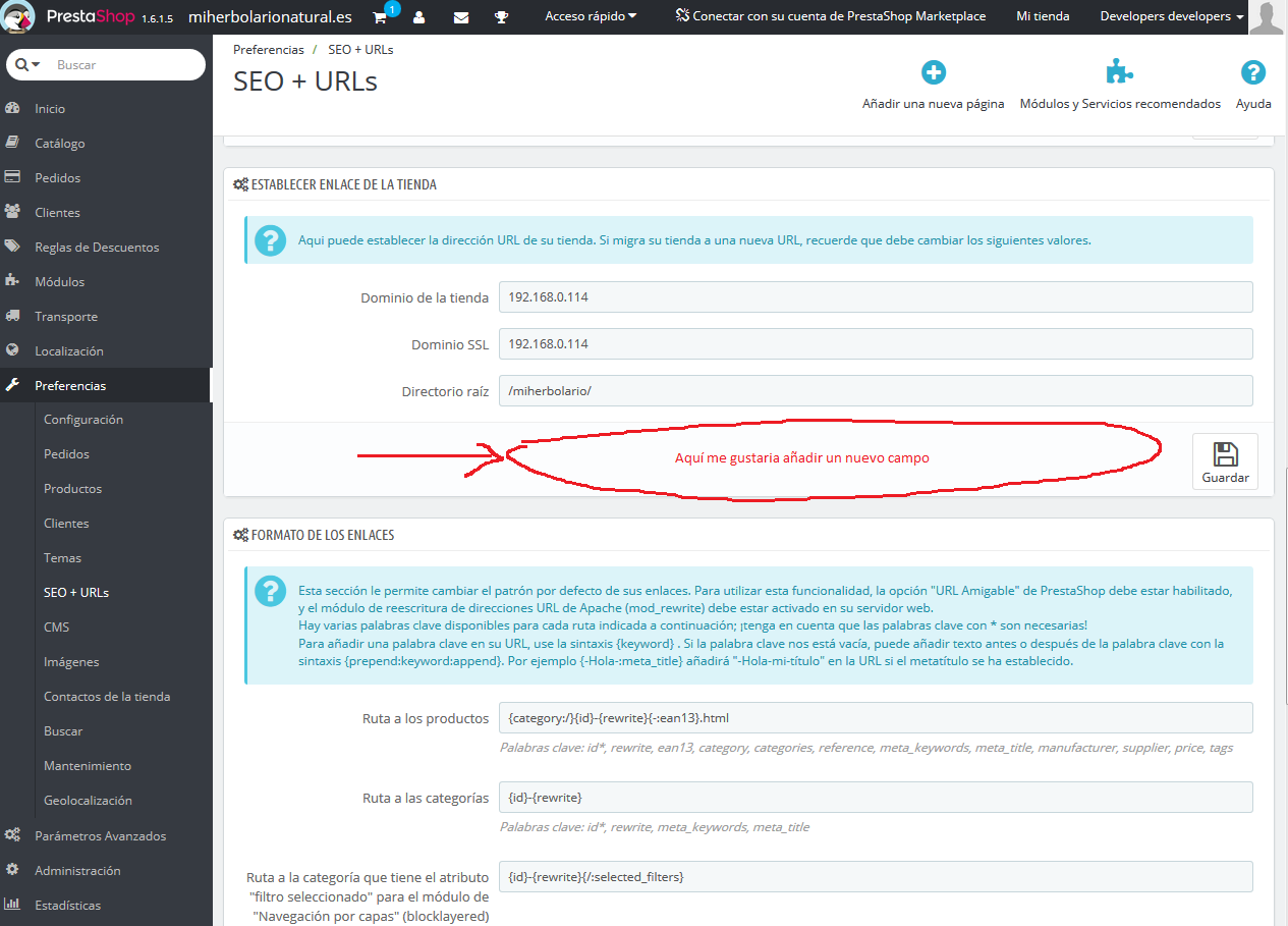 SergioCM Posted June 6, 2016 Share Posted June 6, 2016 Buenos días, Me gustaría añadir un nuevo campo de texto en el apartado Preferencias>SEO+URLs del backoffice de prestashop, que mostraría un campo de la base de datos (ya lo tengo creado) y permitiría su modificación. El problema esque no se donde se encuentra el tpl (supongo que será un tpl) donde se encuentra el código html de esta apartado del backoffice. ¿Alguien puede hecharme una mano? Adjunto una imagen para que quede mas claro. Gracias de antemano! Link to comment Share on other sites More sharing options...