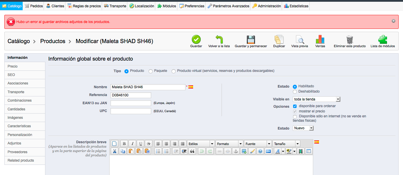 jmvf Posted June 6, 2016 Share Posted June 6, 2016 Hola. Cuando entro a modificar cualquier producto, al pulsar el botón de Guardar me aparece este mensaje de error : "Hubo un error al guardar archivos adjuntos de los productos." Y el caso es que no uso adjuntos en ninguno de mis productos, por lo que no sé porqué me da ese mensaje de error. Deciros también que se trata de la versión 1.5.6.3 de Prestashop. Subo una captura de pantalla con el error por si alguien me puede ayudar. Muchas gracias. Link to comment Share on other sites More sharing options...