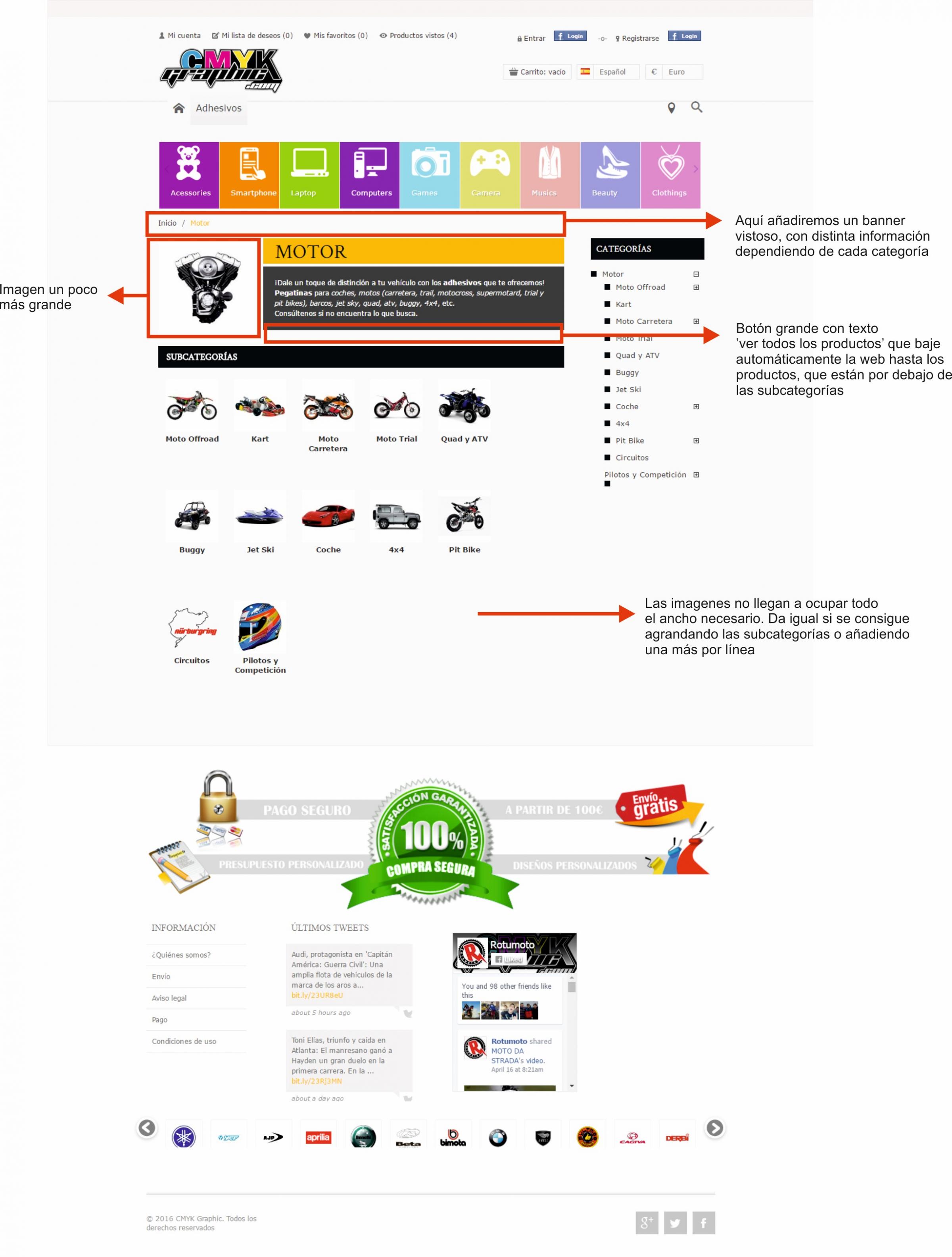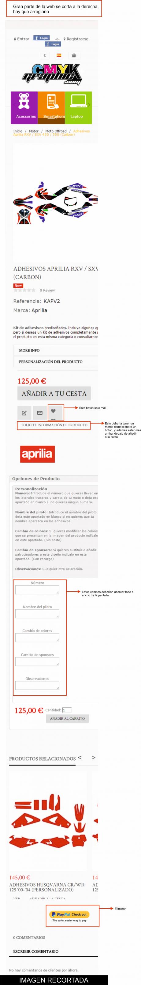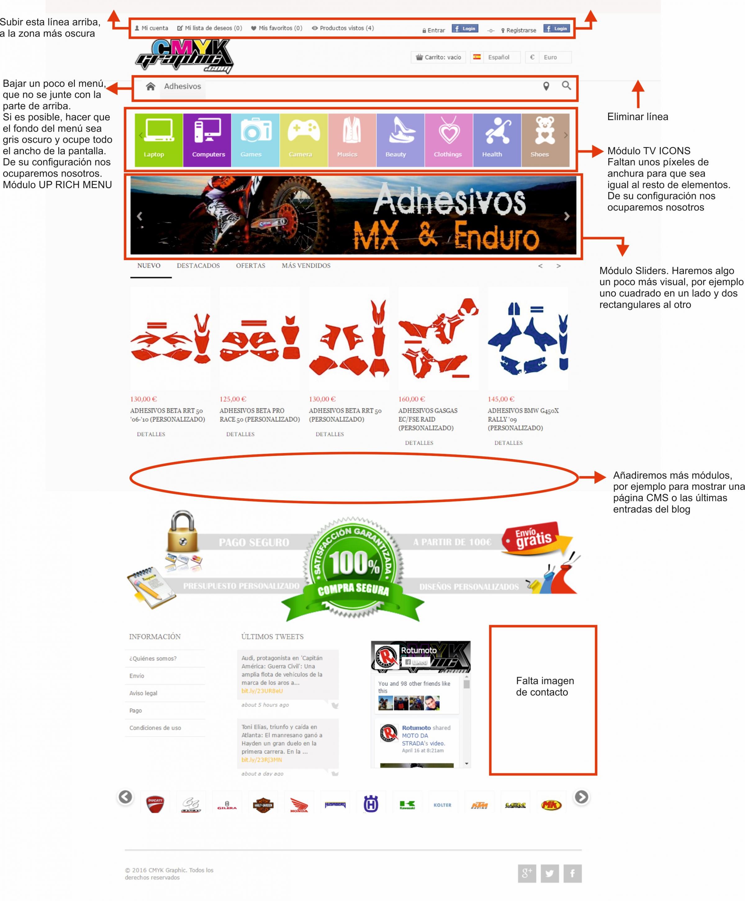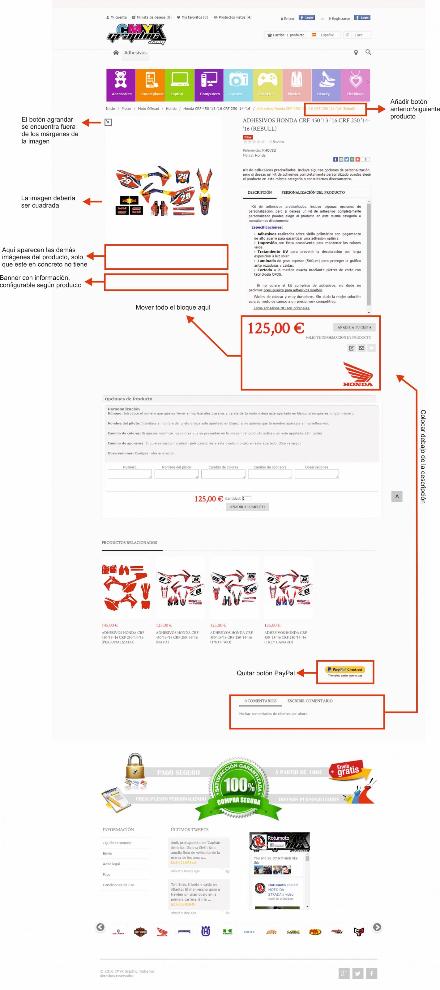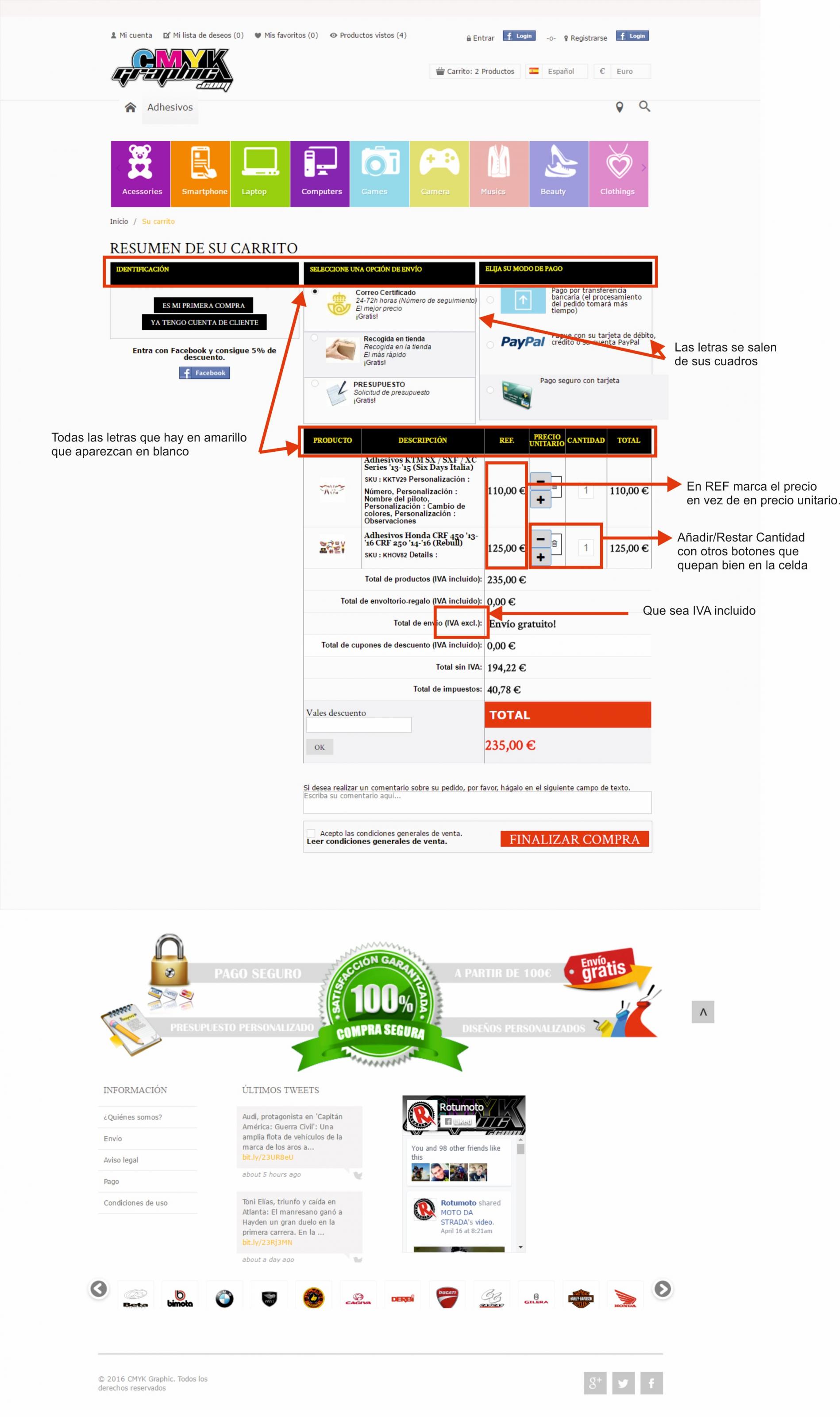 albertotm Posted June 6, 2016 Share Posted June 6, 2016 Buenas tardes, Busco un desarrollador que pueda realizar las siguientes tareas: -Actualización a la última versión con comprobación de que todos los módulos funcionen correctamente (esto no es estrictamente necesario) -Modificación de varias cosillas a nivel gráfico en el front end (detallado en imagenes adjuntas) -Hacer la carga de la web más rápida Una vez hechos estos cambios se volverían a hacer imagenes con más cambios visuales para dejar bien la web y que el uso de la misma sea amigable para el cliente. La versión de Prestashop utilizada es la 1.6.0.9 y la plantilla elegida, la Avena 2.0 de Promokit. El alojamiento está contratado con loading.es y el panel que usan es Plesk Los módulos no nativos instalados son los siguientes (se pueden eliminar varios): !Sliders Everywhere! v1.6.41 - by Syncrea1 Step Checkout v1.3.1 - by EsPrestaShopAttribute Wizard Pro v1.7.7 - by Presto-Changeobannerinferior v0.04 - by EmotionLoop.com (esto es solo una imagen enla parte superior del footer)Bloque zopim v1.5 - by Mediacom87Boletín para Prestashop v4.9 - by Eolia (prescindible)CMS on homepage v1.2.0 - by MyPresta.eu (no activado pero puede serinteresante para algún contenido)Delete Orders Free v1.3 - by MyPresta.eu (sustituible con Borrarordenes v1.1 - by RSI, también instalado pero no sé si compatible)Easy Translator v1.0 - by crinsoft.comEnviar Solicitud de Comentario v0.3 - by www.kik-off.comEuropean Union Cookies Law v1.6.5 - by MyPresta.euExport in CSV v0.2 - by PrestaHost.cz (prescindible)Extramanufacturer v1.9 - by RSIFacebook Connect + Cupón de inscripción v1.0.5 - by www.mitrocops.comFanpage Like Box Gratis v2.2 - by MyPresta.euFast admin v1.0.1 - by custo.me (no activado pero útil)Flush Caches & Compile v1.0 - by kik-off.comGift Card v3.0 - by Loulou66 (prescindible)GoodRelations v1.8 - by MakoLab S.A.Google Rich Snippet v1.3 - by RSIGoogle Shopping v1.0 - by @jordi_martin (no instalado pero puede estarbien ampliar a google shopping)Homepage Category Plus v0.7 - by ckarone (no está en uso y es prescindible)Honeypot v0.1 - by kik-off.comHTML Box Pro v2.5.98 - by MyPresta.euLimpiador de Prestashop v1.8.5 - by PrestaShopMaintenance Tools v2.1 - by kik-off.com (prescindible pero no hay nadadefinido personalizado cuando la página está caída)Man Carousel v1.2.1 - by kik-off.comMass Combination Editor v1.2.1 - by Presto-ChangeoMega Descripciones v0.1 - by www.alabazweb.comMegaReembolso, envíos contra reembolso con recargo v2.5 - by www.alabazweb.comMisa actualización de la cantidad v1.2 - by RSI (no usado y prescindible)Misa actualización de precios v1.9 - by RSIMoussiq v0.9 (no utilzado)Módulo de Pago Universal v1.9 - by PrestaLab.RuMódulos Favoritos v0.1 - by kik-off.comNVN Export Products XML v2.8 L2 - by netvianet.com (prescindible)Ofertas de cuenta atrás v3.0 - by RSI (algún fallo había con este ypor ello no se ha utilizado)Pago con tarjeta. Pago 100% seguro con la entidad bancaria v3.2.5 - by idnovatePassword Widget v0.3 - by www.kik-off.com (no utilizado)PayPal v3.10.2 - by PrestaShopPDF Catalog v2.4 - by Store CommanderpMobile - Prestashop plantilla móvil v2.9 - by RSI Sistemas (borrar, desfasado)Presentación sensible de fabricantes y proveedores v1.5 - by RSI (sin utilizar)PrestaCenter Payments 2 Carriers Free v0.9.1 - by PrestaCenterPrestaNitro Inline editor v2.6 - by PrestaNitroPrestaShop Cleaner Pro v1.5.4.1 - by Daniel WildenProteger RSI v1.8 - by RSIQuantity Discounts v1.2.8 - by Presto-Changeo (no utilizado ydesconozco compatibilidad)RSI SEO v1.0 - by RSISlideCaptcha v2.4 - by RSI (sin utilizar pero me parece interesante)SmartPopupBox v1.1 - by SmartPopupBox (no me interesa mucho aunquepara alguna promo puede estar bien)Smart Short Code v2.3.0 - by SmartDataSoftSmush Optimize Image v1.0.7 - by PresTeamShop.comSocial Login v2.0 - by LoginRadius (sin usar actualmente por algúnproblema con el diseño creo recordar)Solicite información de producto v1.2 - by RSIStore Commander Installer v1.3.6 - by Store CommanderT-Shirt Customization v1.1 - by SolverCircle (sin uso)TPV Virtual Redsys - Recibe pagos sin pedidos v1.1.7 - by idnovate.comTV Menu Icon v2.5.4 - by ThemesvipUp Rich Menu v1.3.2 - by PrestaddonsSuperuser v1.6WhatsApp Sharing Button v1.1 - by kik-off.comWordpress2Prestashop v0.1.0 (puede estar bien para enlazar las ultimasentradas del blog)Yotpo - Social Reviews and Testimonials v1.4.3 - by Yotpo (sin usarpero me gusta que los clientes puedan escribir opiniones)También están instalados todos los que traía la plantilla Avena 2.0 de PromokitComo podéis ver hay algunos módulos que hacen lo mismo, otros de losque se puede prescindir, y algunos instalados sólo por probar.También nos interesa un módulo de buhoc (prestashopoutlet) para lasección de vinilos decorativos que entre sus funciones está la decambiar de color un png, colocarlo sobre una imagen standard o subidapor el cliente, y cálculo del precio teniendo en cuenta medidas deancho y largo. Este módulo creo que lo instalan y adaptan ellos. Necesitaría saber un presupuesto aproximado, al igual que el plazo de realización, dado que nos corre un poco de prisa. Para contactar conmigo puede hacerse respondiendo a este mismo post, enviando un MP, por email a [email protected], o por teléfono/whatsapp al 679783309 Un saludo y muchas gracias por vuestra atención Link to comment Share on other sites More sharing options...