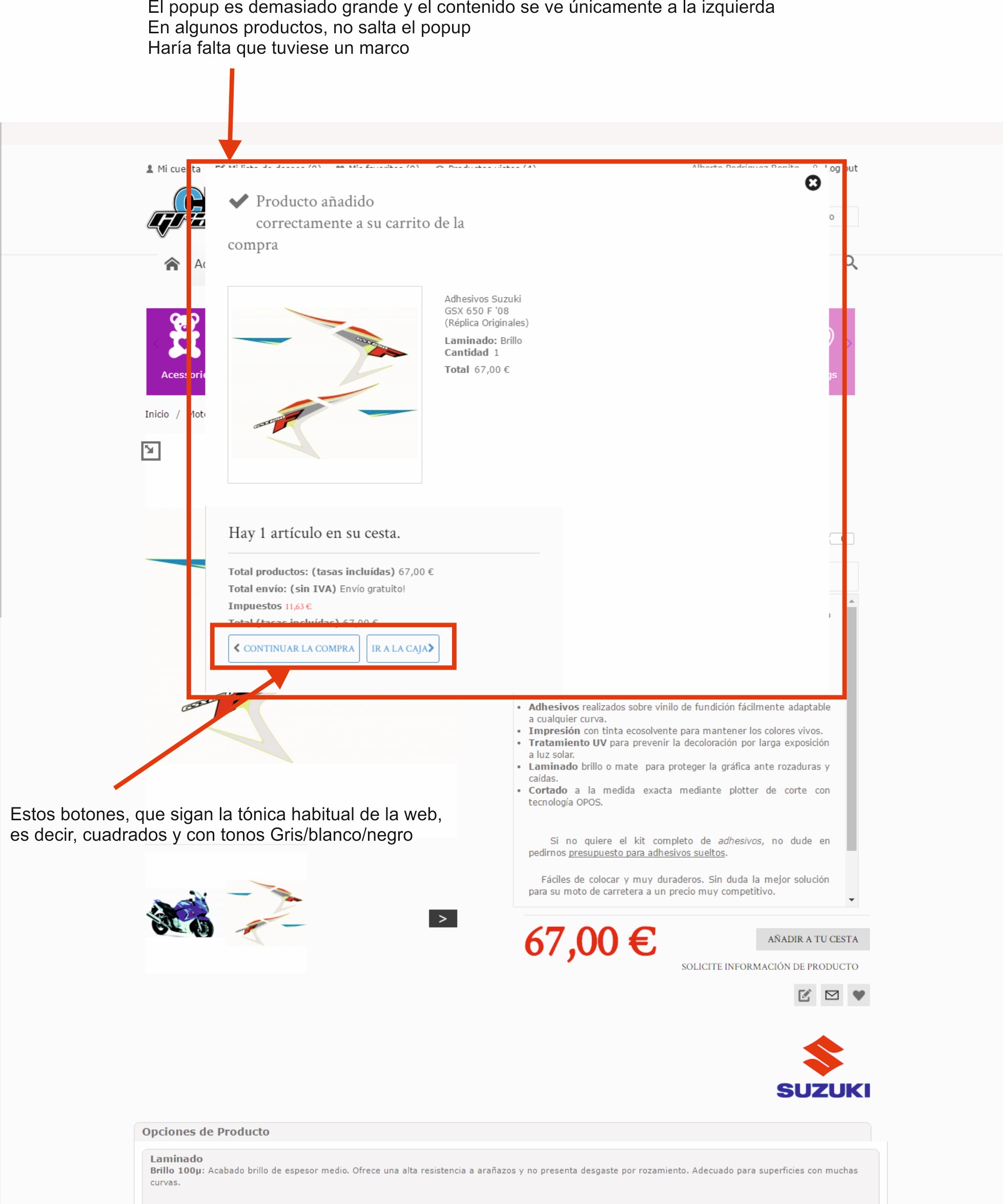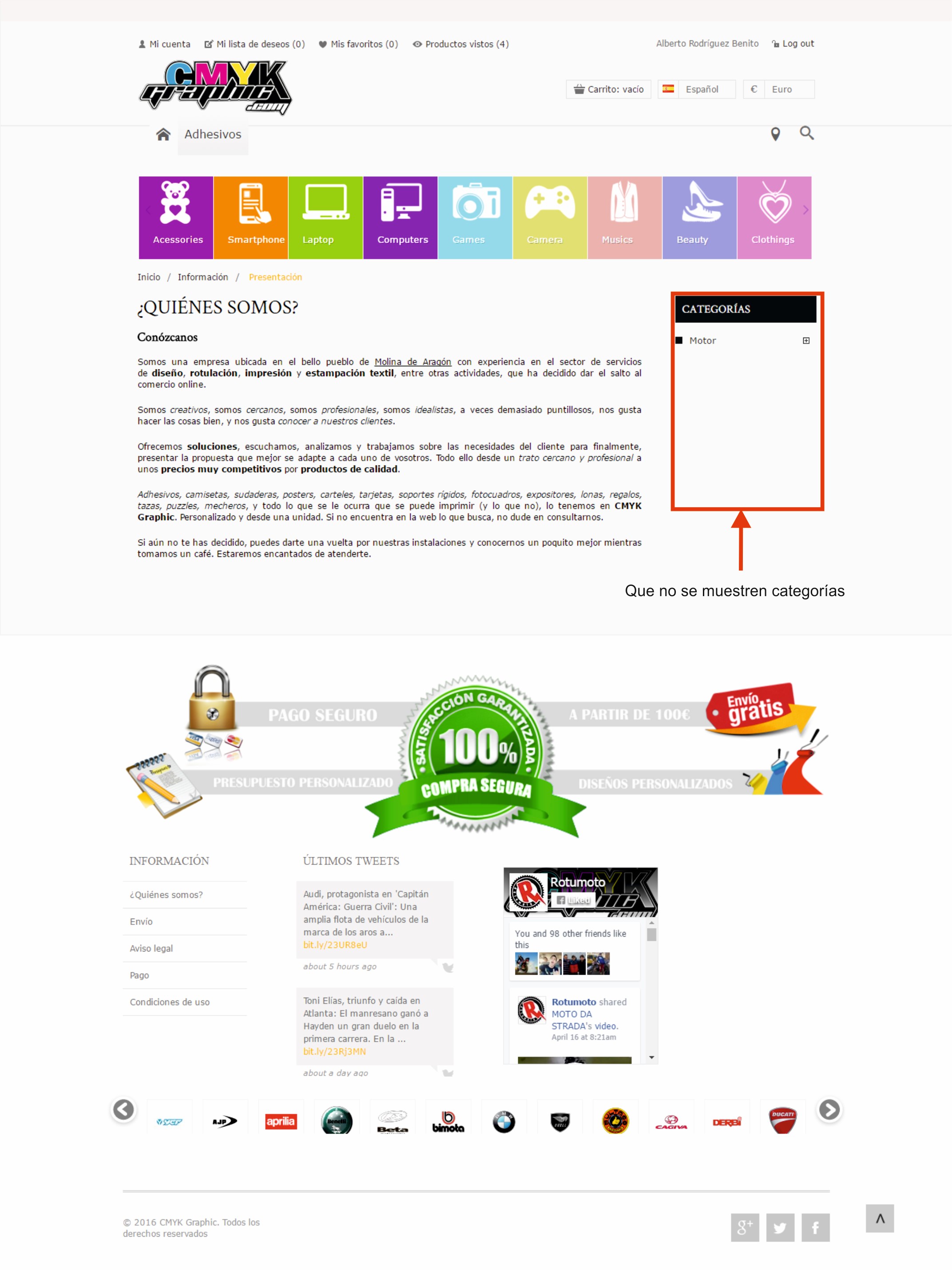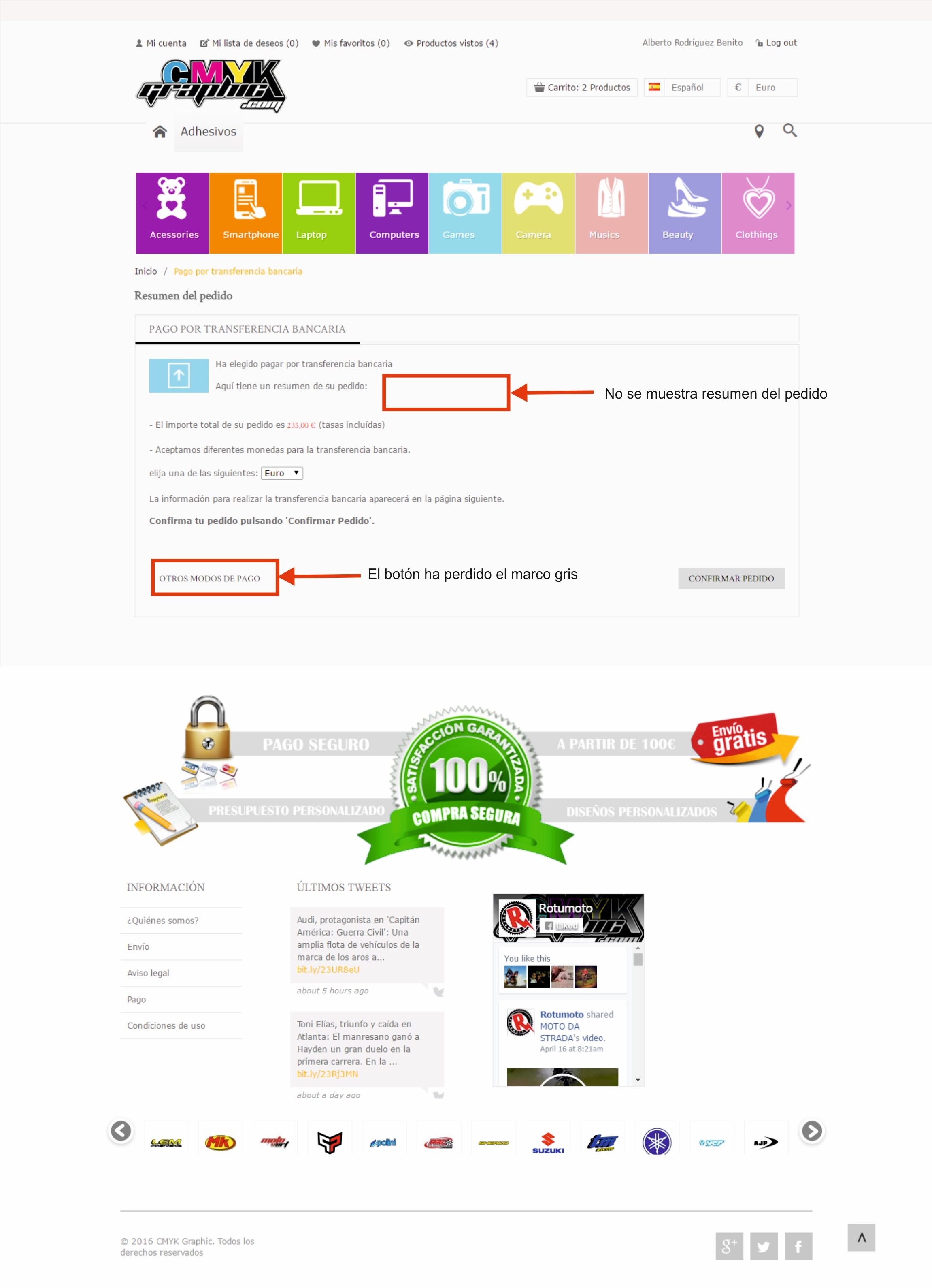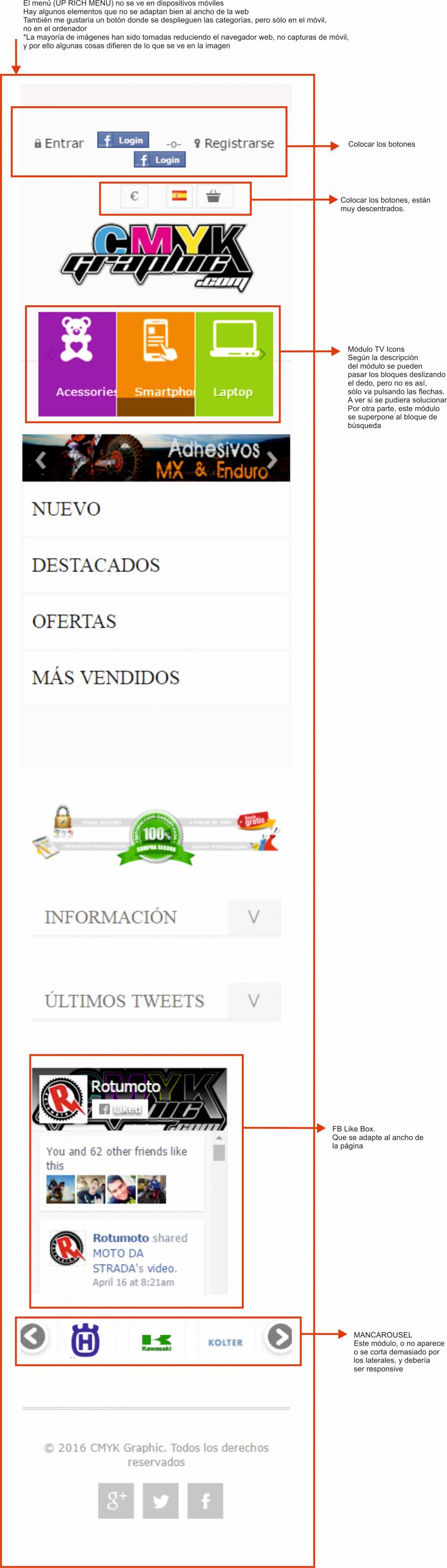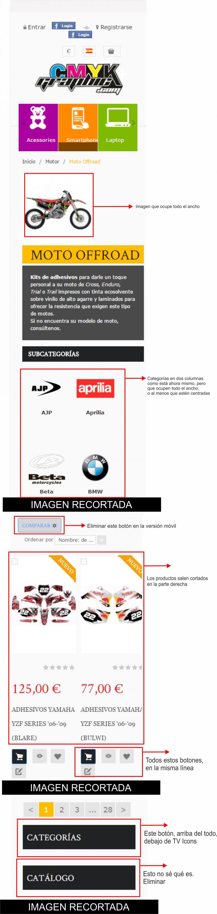 albertotm Posted June 6, 2016 Share Posted June 6, 2016 Buenas tardes, Busco un desarrollador que pueda realizar las siguientes tareas: -Actualización a la última versión con comprobación de que todos los módulos funcionen correctamente (esto no es estrictamente necesario) -Modificación de varias cosillas a nivel gráfico en el front end (detallado en imagenes adjuntas) -Hacer la carga de la web más rápida Una vez hechos estos cambios se volverían a hacer imagenes con más cambios visuales para dejar bien la web y que el uso de la misma sea amigable para el cliente. La versión de Prestashop utilizada es la 1.6.0.9 y la plantilla elegida, la Avena 2.0 de Promokit. El alojamiento está contratado con loading.es y el panel que usan es Plesk Los módulos no nativos instalados son los siguientes (se pueden eliminar varios): !Sliders Everywhere! v1.6.41 - by Syncrea1 Step Checkout v1.3.1 - by EsPrestaShopAttribute Wizard Pro v1.7.7 - by Presto-Changeobannerinferior v0.04 - by EmotionLoop.com (esto es solo una imagen enla parte superior del footer)Bloque zopim v1.5 - by Mediacom87Boletín para Prestashop v4.9 - by Eolia (prescindible)CMS on homepage v1.2.0 - by MyPresta.eu (no activado pero puede serinteresante para algún contenido)Delete Orders Free v1.3 - by MyPresta.eu (sustituible con Borrarordenes v1.1 - by RSI, también instalado pero no sé si compatible)Easy Translator v1.0 - by crinsoft.comEnviar Solicitud de Comentario v0.3 - by www.kik-off.comEuropean Union Cookies Law v1.6.5 - by MyPresta.euExport in CSV v0.2 - by PrestaHost.cz (prescindible)Extramanufacturer v1.9 - by RSIFacebook Connect + Cupón de inscripción v1.0.5 - by www.mitrocops.comFanpage Like Box Gratis v2.2 - by MyPresta.euFast admin v1.0.1 - by custo.me (no activado pero útil)Flush Caches & Compile v1.0 - by kik-off.comGift Card v3.0 - by Loulou66 (prescindible)GoodRelations v1.8 - by MakoLab S.A.Google Rich Snippet v1.3 - by RSIGoogle Shopping v1.0 - by @jordi_martin (no instalado pero puede estarbien ampliar a google shopping)Homepage Category Plus v0.7 - by ckarone (no está en uso y es prescindible)Honeypot v0.1 - by kik-off.comHTML Box Pro v2.5.98 - by MyPresta.euLimpiador de Prestashop v1.8.5 - by PrestaShopMaintenance Tools v2.1 - by kik-off.com (prescindible pero no hay nadadefinido personalizado cuando la página está caída)Man Carousel v1.2.1 - by kik-off.comMass Combination Editor v1.2.1 - by Presto-ChangeoMega Descripciones v0.1 - by www.alabazweb.comMegaReembolso, envíos contra reembolso con recargo v2.5 - by www.alabazweb.comMisa actualización de la cantidad v1.2 - by RSI (no usado y prescindible)Misa actualización de precios v1.9 - by RSIMoussiq v0.9 (no utilzado)Módulo de Pago Universal v1.9 - by PrestaLab.RuMódulos Favoritos v0.1 - by kik-off.comNVN Export Products XML v2.8 L2 - by netvianet.com (prescindible)Ofertas de cuenta atrás v3.0 - by RSI (algún fallo había con este ypor ello no se ha utilizado)Pago con tarjeta. Pago 100% seguro con la entidad bancaria v3.2.5 - by idnovatePassword Widget v0.3 - by www.kik-off.com (no utilizado)PayPal v3.10.2 - by PrestaShopPDF Catalog v2.4 - by Store CommanderpMobile - Prestashop plantilla móvil v2.9 - by RSI Sistemas (borrar, desfasado)Presentación sensible de fabricantes y proveedores v1.5 - by RSI (sin utilizar)PrestaCenter Payments 2 Carriers Free v0.9.1 - by PrestaCenterPrestaNitro Inline editor v2.6 - by PrestaNitroPrestaShop Cleaner Pro v1.5.4.1 - by Daniel WildenProteger RSI v1.8 - by RSIQuantity Discounts v1.2.8 - by Presto-Changeo (no utilizado ydesconozco compatibilidad)RSI SEO v1.0 - by RSISlideCaptcha v2.4 - by RSI (sin utilizar pero me parece interesante)SmartPopupBox v1.1 - by SmartPopupBox (no me interesa mucho aunquepara alguna promo puede estar bien)Smart Short Code v2.3.0 - by SmartDataSoftSmush Optimize Image v1.0.7 - by PresTeamShop.comSocial Login v2.0 - by LoginRadius (sin usar actualmente por algúnproblema con el diseño creo recordar)Solicite información de producto v1.2 - by RSIStore Commander Installer v1.3.6 - by Store CommanderT-Shirt Customization v1.1 - by SolverCircle (sin uso)TPV Virtual Redsys - Recibe pagos sin pedidos v1.1.7 - by idnovate.comTV Menu Icon v2.5.4 - by ThemesvipUp Rich Menu v1.3.2 - by PrestaddonsSuperuser v1.6WhatsApp Sharing Button v1.1 - by kik-off.comWordpress2Prestashop v0.1.0 (puede estar bien para enlazar las ultimasentradas del blog)Yotpo - Social Reviews and Testimonials v1.4.3 - by Yotpo (sin usarpero me gusta que los clientes puedan escribir opiniones)También están instalados todos los que traía la plantilla Avena 2.0 de PromokitComo podéis ver hay algunos módulos que hacen lo mismo, otros de losque se puede prescindir, y algunos instalados sólo por probar.También nos interesa un módulo de buhoc (prestashopoutlet) para lasección de vinilos decorativos que entre sus funciones está la decambiar de color un png, colocarlo sobre una imagen standard o subidapor el cliente, y cálculo del precio teniendo en cuenta medidas deancho y largo. Este módulo creo que lo instalan y adaptan ellos. Necesitaría saber un presupuesto aproximado, al igual que el plazo de realización, dado que nos corre un poco de prisa. Para contactar conmigo puede hacerse respondiendo a este mismo post, enviando un MP, por email a [email protected], o por teléfono/whatsapp al 679783309 Un saludo y muchas gracias por vuestra atención Link to comment Share on other sites More sharing options...