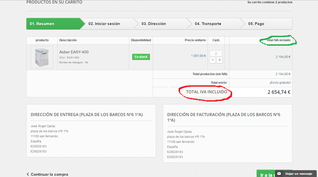 Buenas, me fijado que en el carrito de mi tienda prestashop, tengo los productos sin iva, pero cuando procedo a realizar la compra, en el resumen final me aparece: