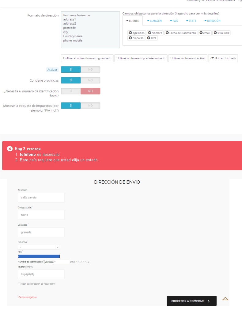 asm2001 Posted June 9, 2016 Share Posted June 9, 2016 Hola amigos, tengo un problema que no me deja avanzar, a ver si a alguien mas le pasa.Tengo activada la compra rapida (tambien pasa cuando me registro y meto una direccion) y es que el desplegable de las provincias me aparece vacio, sin nada que seleccionar, y claro, me da error ya que el pais requiere una provincia.Y tambien me pasa igual con el telefono, en la configuracion del pais (españa) los campos que tengo especificados en el textbox "formato de direccion" ponga o no ponga el telefono, no me aparece ese campo para rellenar, y me da error por tanto de que "se necesita un telefono", y esto pese a haber puesto que NO es necesario un telefono en "preferencias->clientes->El número de teléfono es obligatorio"es problema de prestashop o de la plantilla que he comprado? estoy usando prestashop 1.6.1.5 y una plantilla comprada, la SHOES de BelVG.alguien sabe como solventar este problema? adjunto una imagen con la configuracion del campo que comento, el error que me da, y el desplegable con las provincias que sale vacio. Gracias. Link to comment Share on other sites More sharing options...