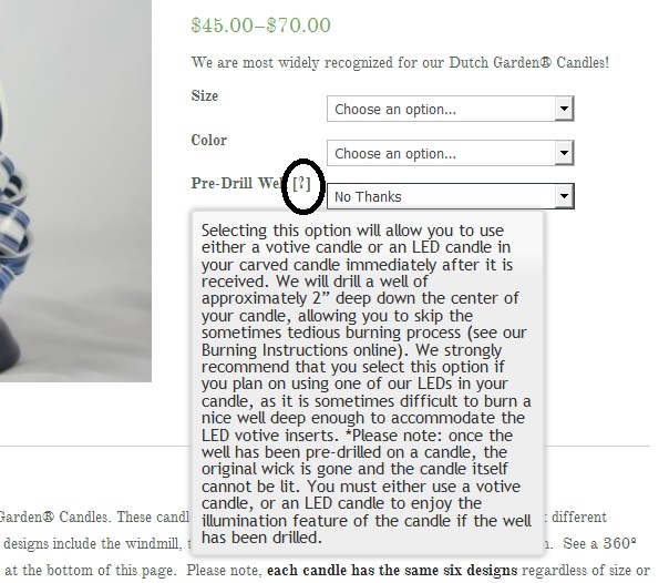 rocky Posted June 12, 2016 Share Posted June 12, 2016 I'm unfamiliar with your theme, so I can only give you advice on the default PrestaShop theme. Hopefully, you can adapt it to your theme. The easiest solution I can think of is to edit product-list.tpl and find the following code (on line 343 of the default PrestaShop v1.6.1.5 theme): <label class="attribute_label" {if $group.group_type != 'color' && $group.group_type != 'radio'}for="group_{$id_attribute_group|intval}"{/if}>{$group.name|escape:'html':'UTF-8'} </label> And change it to: <label class="attribute_label" {if $group.group_type != 'color' && $group.group_type != 'radio'}for="group_{$id_attribute_group|intval}"{/if}>{$group.name|escape:'html':'UTF-8'} {if $id_attribute_group == 1}<a href="javascript:" title="{l s='Selecting this option will allow you to use either a votive candle or an LED candle in your carved candle immediately after it is received. We will drill a well of approximately 2" deep down the center of your candle, allowing you to skip the sometimes tedious burning process (see your Burning Instructions online). We strongly recommend that you select this option if you plan on using one of our LEDs in your candle, as it is sometimes difficult to burn a nice well deep enough to accommodate the LED votive inserts. *Please note: once the well has been pre-drilled on a candle, the original wick is gone and the candle itself cannot be lit. You must either use a votive candle, or an LED candle to enjoy the illumination feature of the candle if the well has been drilled.'}">[?]</a>{/if}</label> Change 1 in the if statement to the ID of the "Pre-Drill Well" attribute group. You can find the ID on the Catalog > Product Attributes tab to find the ID. Link to comment Share on other sites More sharing options...