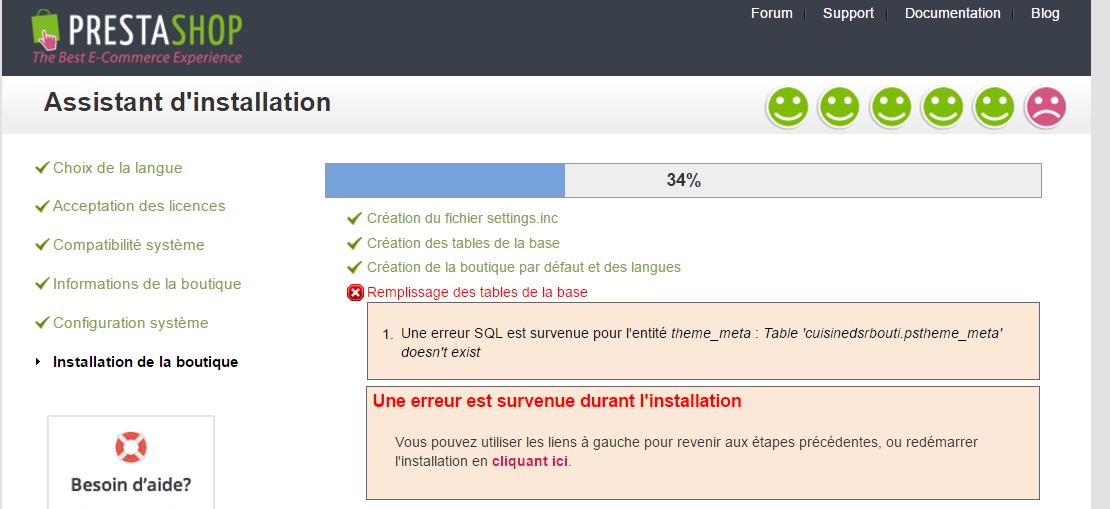 pizzeria exemple Posted June 11, 2016 Share Posted June 11, 2016 Je pourrais attaquer votre société pour pub mensongère. Lundi dernier, je vous ai contacté pour un problème d'installation de la version 1.6.1.5 de Prestashop, sur mon PC . Vous disiez "réponse sous 48h" . Cela fait 5 jours et toujours rien !! J'ai également parlé de mon problème sur le Forum, j'ai eu des réponses mais pas précise quand j'ai demandé des précisions, rien depuis. Idem sur les réseaux sociaux Facebook et Twitter Prenant comme souvent mon mal en patience, j'ai essayé la version 1.6.1.3 pareil puis la 1.5.9 et là miracle, l'installation s'est lancé. J'étais content sauf qu'en cours d'installation un message inexplicable voir fichier ci joint: une table pstheme_meta qui n'existe pas. J'ai cherché, j'ai réinstallé à nouveau la version. Voyant que ça n fonctionnait pas créer la table sur phpmyadmin mais toujours rien !! En attendant, j'ai une cliente qui veut une boutique pour fin juin et là je suis très mal. Autant vous dire, si vous lisez ce message, ce dont je doute que je ne suis pas content du tout de votre société et j'envisage comme je fais aussi du wordpress, de créer des boutiques sur Woocommerce. Un usager mécontent Link to comment Share on other sites More sharing options...