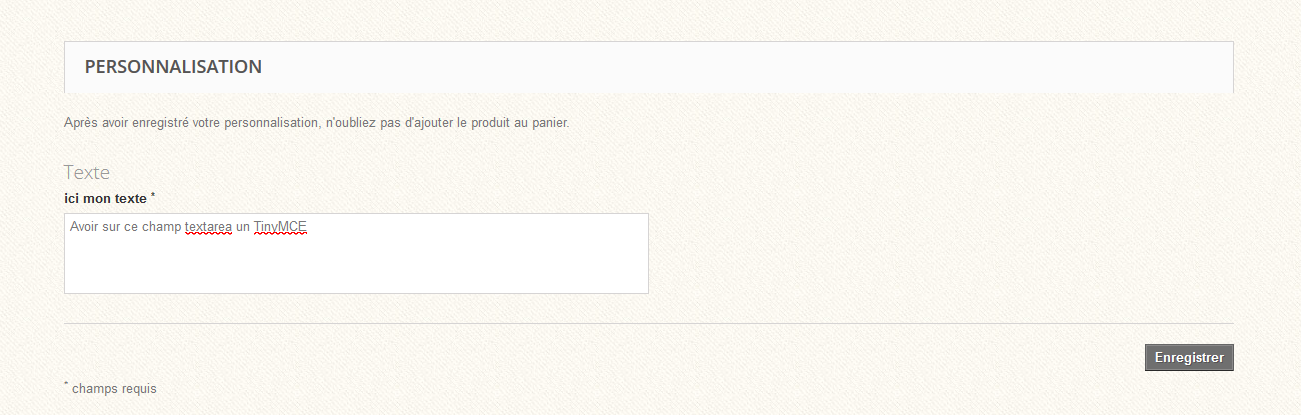 Timyx Posted June 14, 2016 Share Posted June 14, 2016 Bonjour, je souhaiterais permettre à mes clients de d'ajouter un texte personnalisé sur les produits. Un simple TinyMCE sur le textarea du champ personnalisation me suffirait. J'ai réussi à placer un Tiny MCE au bon endroit mais il semble qu'un "controler" interdise les balise HTML sur ces champs (ma démarche ne doit pas être la bonne :-( ) du coup quand je valide la personnalisation j'ai un message d'erreur. Auriez-vous des pistes ? Merci d'avance, Link to comment Share on other sites More sharing options...