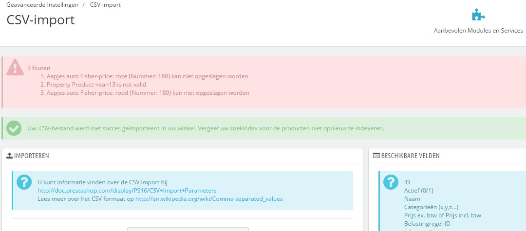 Ik kan zonder problemen het bestand importeren, maar dan komt er te staan dat de producten niet opgeslagen kunnen worden. Weet iemand toevallig wat ik fout doe?