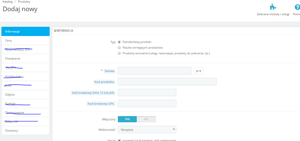 Witam chciałbym nieco zmodernizować dodawanie produktów i ukryć karty z których nie korzystam przy dodawaniu produktu z zaplecza