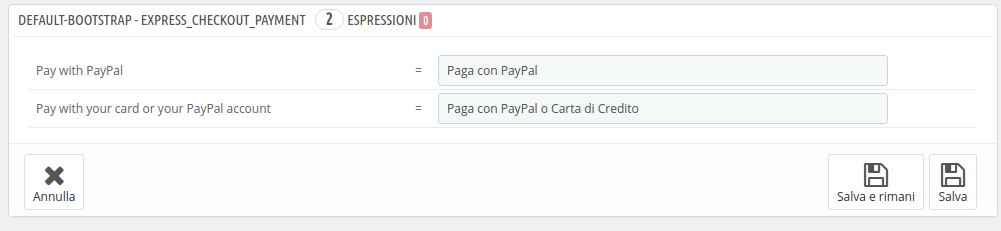 roombausato Posted June 23, 2016 Author Share Posted June 23, 2016 Si prega di notare che con l'ultima Paypal 3.7.2 versione, è possibile finalmente fare la traduzione con il normale sistema di traduzione Prestashop. A trovare la variabile di traduzione: Localizzazione -> Traduzione -> Traduzione Moduli instalati -> <Il Tema>Ricerca di modulo Paypal, tradurre nella sezioneEXPRESS_CHECKOUT_PAYMENT e INTEGRAL_EVOLUTION_PAYMENT Grazie per la spiegazione, ma ancora non riesco a collegare quanto mi hai descritto. Ora ho modificato i valori nel php.ini portando a 5000 e mi fa vedere questo: MODULO ITALIANO MODULO INGLESE Tutto questo per tradurre questa frase: il modulo installato è il modulo paypal 3.10.9 sono diversi giorni che cerco di trovare una soluzione. Grazie per l'aiuto Link to comment Share on other sites More sharing options...