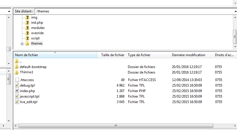 Oron Posted June 23, 2016 Share Posted June 23, 2016 Salut merci de ta réponse rapide mais la tu ma perdu Quand dans le menu je vais sur PREFERENCE puis Theme rien qui s'affiche pour tans dans mon compte je vois bien que j'ai acheter et que l'on peut le telecharger ceux que j'ai fait PS: je suis nul en informatique et que j'ai decider de faire travailler ma femme moi je suis le mari et ma femme veut faire un site internet de commerce mais c'est pas comment on fait alors on essaye Bonjour Ça ne répond pas à ma question : Vous ne le voyez pas dans le back office OK, mais sur le FTP Comme sur l'image avez-vous un deuxième dossier thème ? Si oui les problèmes peuvent être dû aux droits ou une erreur dans un fichier. Quand vous l'avez installer la première fois, il s'est bien afficher ? Et avant qu'il disparaisse vous avez fait une action ou autre manipulation ? Link to comment Share on other sites More sharing options...