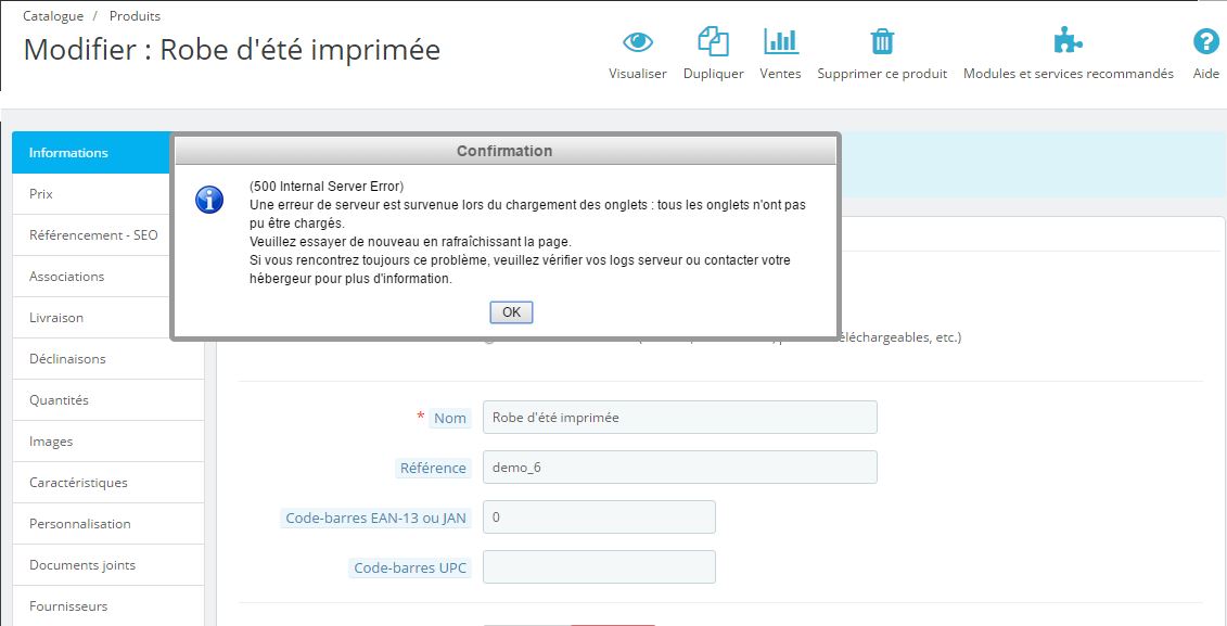 ThibaultC Posted June 24, 2016 Share Posted June 24, 2016 (edited) Bonjour à tous, J'ai une erreur 500 qui m'empêche d'ajouter ou modifier un produit sur Prestashop. Voir la capture d'écran. Quelqu'un peut-il m'indiquer la marche à suivre afin de régler ce bug. Je travaille en local avec Wamp Merci beaucoup. Edited June 24, 2016 by ThibaultC (see edit history) Link to comment Share on other sites More sharing options...