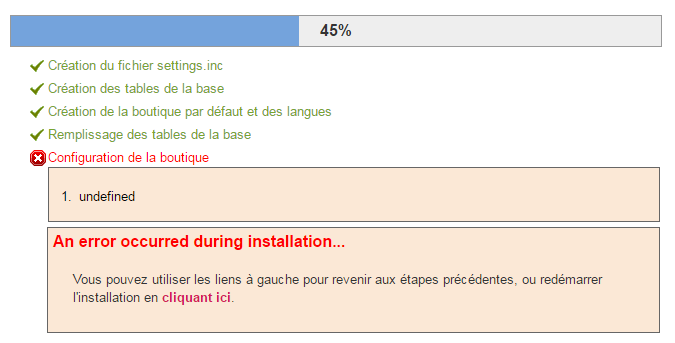 zabra Posted June 29, 2016 Share Posted June 29, 2016 Bonjour, Depuis 2 jours j'essaie d'installer l'ancienne version prestashop 1.6.0.9 afin de pouvoir travailler en parallèle sur un site qui utilise cette version. Mais voilà, à chaque fois l'installation échoue à 45% et on m'affiche: Qu' une erreur est survenue (undefined error occured) et me propose de relancer l'installation ou de revenir aux étapes précédentes, mais j'ai fais tout ceci mais rien n'évolue, j' ai effacé la bdd et crée une nouvelle, redémarrer wamp, changer le dossier prestashop dans wamp/www/ mais rien toujours l’échec à 45% J'ai regardé le fichier log de presta après les échecs et c'est marqué: erreur: impossible de créer le compte administrateur. j'ai fouillé sur internet mais je ne trouve pas de solution à ce problème. Si vous pouvez donc m'aider ça serait sympa! Merci!! Link to comment Share on other sites More sharing options...