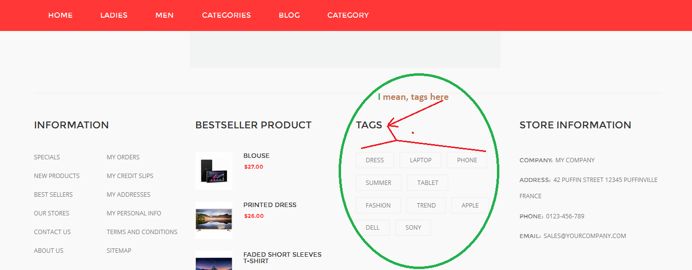 rocky Posted July 5, 2016 Share Posted July 5, 2016 The "Tags block" is not designed to be placed in the footer, so you'll have to modify the module to enable it to be placed there. For example, you can copy and rename the hookLeftColumn function from modules/blocktags/blocktags.php and change the template from blocktags to blocktags_footer like this: function hookFooter($params) { if (!$this->isCached('blocktags.tpl', $this->getCacheId('blocktags'))) { $tags = Tag::getMainTags((int)($params['cookie']->id_lang), (int)(Configuration::get('BLOCKTAGS_NBR'))); $max = -1; $min = -1; foreach ($tags as $tag) { if ($tag['times'] > $max) $max = $tag['times']; if ($tag['times'] < $min || $min == -1) $min = $tag['times']; } if ($min == $max) $coef = $max; else $coef = (Configuration::get('BLOCKTAGS_MAX_LEVEL') - 1) / ($max - $min); if (!count($tags)) return false; if (Configuration::get('BLOCKTAGS_RANDOMIZE')) shuffle($tags); foreach ($tags as &$tag) $tag['class'] = 'tag_level'.(int)(($tag['times'] - $min) * $coef + 1); $this->smarty->assign('tags', $tags); } return $this->display(__FILE__, 'blocktags_footer.tpl', $this->getCacheId('blocktags')); } You can then copy themes/<your_theme>/modules/blocktags/blocktags.tpl to themes/<your_theme>/modules/blocktags/blocktags_footer.tpl and then modify the file so it matches the other modules in the footer. You may need to add code to themes/<your_theme>/css/modules/blocktags/blocktags.css to style the block too. Link to comment Share on other sites More sharing options...