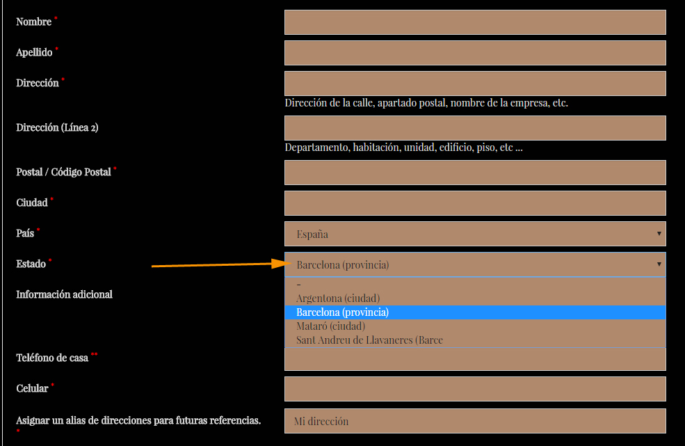 Hecho de esta manera el cliente debe escoger el Estado y según el que seleccione se le aplica un transportista. La idea parece buena pero la gente entiende Estado como provincia y selecciona Barcelona (Captura Se42) en lugar de las otras tres ciudades y causa confusión.