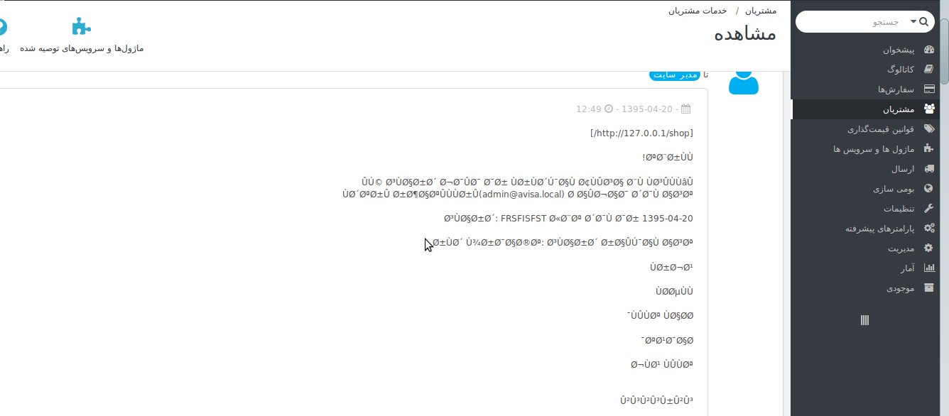 atpersian Posted July 10, 2016 Share Posted July 10, 2016 (edited) Dear Friend prestashop 1.6 server = local Lamp mail server on local= ubuntu mail server encoding= utf-8 lang= Fa-Ir i have problem with CMR in admin panel.when i have new order . email send to admin and customer successfully i can see email in admin webmail correctly in my language.but when i fetch it with Imap in CRM it look like attached file. how can i get fix this issue??? i appropriate that somebody helm me . Edited July 10, 2016 by atpersian (see edit history) Link to comment Share on other sites More sharing options...