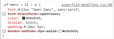 miaweb Posted July 24, 2016 Author Share Posted July 24, 2016 (edited) .sf-menu > li > a { font: 600 18px/22px "Open Sans", sans-serif; text-transform: uppercase; color: #484848; display: block; padding: 17px 20px; border-bottom: 3px solid #e9e9e9; } .sf-menu > li.sfHover > a, .sf-menu > li > a:hover, .sf-menu > li.sfHoverForce > a { background: #333; border-bottom-color: #666666; color: #fff; } AHORA SI YA ENCONTRE EL ARCHIVO!!!.... ...sh-modified.css TEMA CERRADO!!!...TEMA SOLUCIONADO!!!... Edited July 24, 2016 by miaweb (see edit history) 1 Link to comment Share on other sites More sharing options...