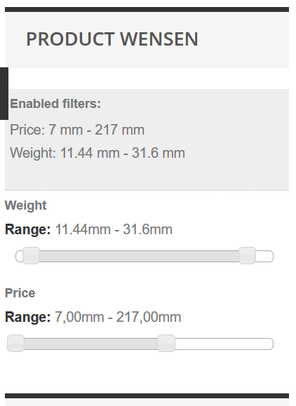 Foramen Posted July 11, 2016 Share Posted July 11, 2016 Dear community, I've been fiddling around with building my own prestashop for quite some time now and the pieces are falling together quite nicely. Yet I do have a question I hope someone could give me the answer to. I'm using Layered navigation in order to navigate through my products, here you can choose to have a range selector for both 'price' and 'weight'. I have come to the understanding that its not yet possible to have custom sliders so I am trying to work my way around it. I would like to have those two words changed to something else as I dont need to select for price nor weight. Where in the code is it possible to change those for instance 'price' to 'length' and weigth to 'width' this way I'll be able to use two range sliders instead of checkboxes. Cheers! Link to comment Share on other sites More sharing options...