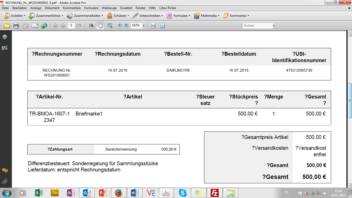 maddy777 Posted July 16, 2016 Share Posted July 16, 2016 Hallo Ich möchte die Übersetzung einiger PDF-Rechnungsbestandteile ändern. Die dafür verantwortliche Datei habe ich lokalisiert: pdf.php im Ordner (translations/de/pdf.php). Zum Problem: Sobald ich die Datei ändere und neu hochlade (mit Filezilla) haben fast alle Wörter in der PDF-Rechnung ein Fragezeichen am Anfang. Korrigiere ich die Änderung wieder zurück, bleiben die Fragezeichen. Ich kann die Änderung nur rückgängig machen, wenn ich die Sicherungskopie der pdf.php hochlade. Screenshot anbei (die Fragezeichen sind auch noch weiter oben: ?Lieferadresse, ?Rechnungsadresse - ich habe aber nur 1 Wort ohne Sonderzeichen geändert) Wie kann ich dieses Problem lösen? Ich bin sehr dankbar für Hinweise. Maddy Link to comment Share on other sites More sharing options...