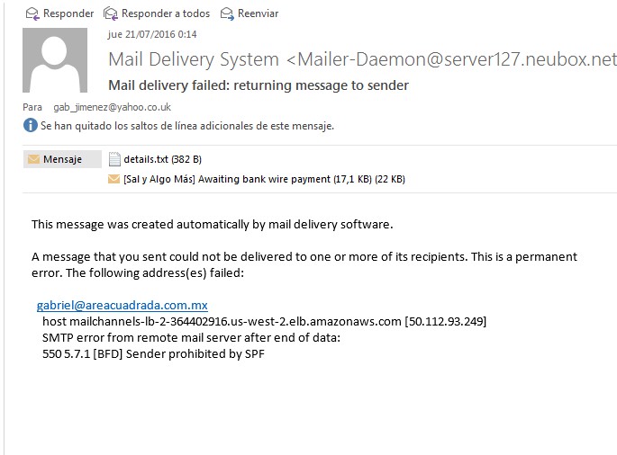 helldriver Posted July 21, 2016 Share Posted July 21, 2016 Hola buenas noches. Mi problema es que al abrir una cuenta nueva no me envia el mensaje a la cuenta que le estoy pidiendo ej [email protected] pero me manda un correo fallido que dice así a otra dirección que es la de administrador de la tienda. This message was created automatically by mail delivery software. A message that you sent could not be delivered to one or more of its recipients. This is a permanent error. The following address(es) failed: [email protected] host mailchannels-lb-2-364402916.us-west-2.elb.amazonaws.com [50.112.93.249] SMTP error from remote mail server after end of data: 550 5.7.1 [bFD] Sender prohibited by SPF Tengo instalada la versión 1.5.6.3 y necesito saber como resuelvo este problema pues no se como darle solución. Gracias. Link to comment Share on other sites More sharing options...