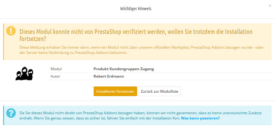 Scully Posted September 12, 2017 Share Posted September 12, 2017 Da es ein kostenloses Modul ist und freundlicherweise zur Verfügung gestellt wird, wirst Du vermutlich keinen "offizielleren" Download finden, als diesen hier. Meines Erachtens stehen die Chancen nicht schlecht, dass das auch mit 1.6.1.14 läuft. Ich würde vor dem Installieren einen Backup des Shops machen und einfach mal testen. Link to comment Share on other sites More sharing options...