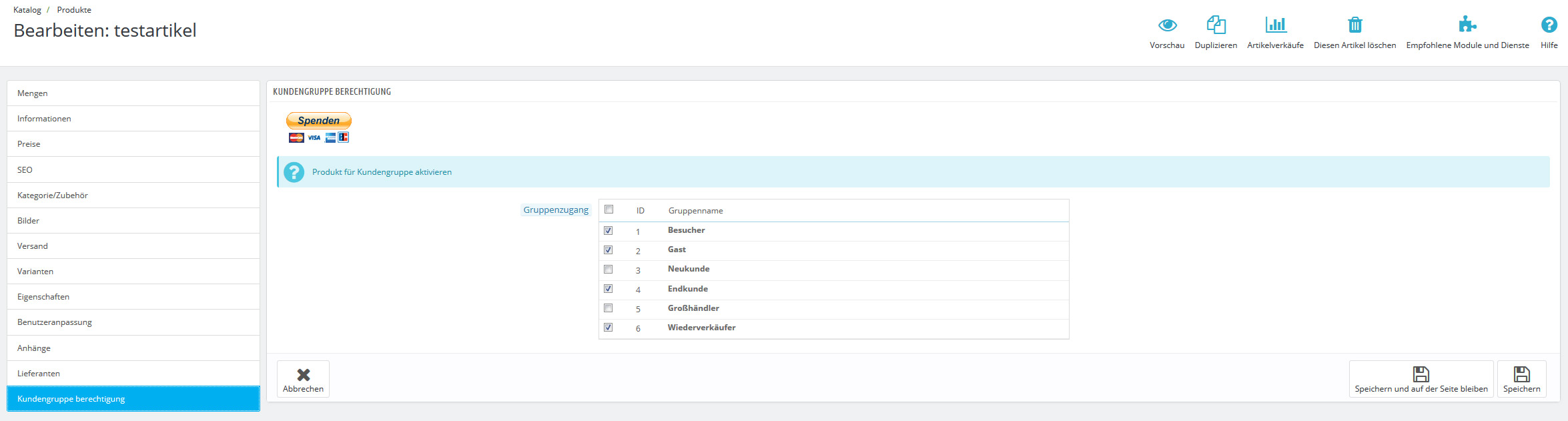 Whiley Posted July 24, 2016 Share Posted July 24, 2016 Hallo Elias, danke fürs Teilen! Aber was genau müsste denn passieren wenn das Produkt für eine bestimmte Kundengruppe deaktiviert ist? Ich habe das Modul mal im Demoshop installiert. - class_index.php gelöscht - Smarty Cache gelöscht - Smarty neu kompilliert - Bowsercache gelöscht - beim Artikel "Blouse" alle Häkchen bei Group access rausgenommen (also für keine Kundengruppe aktiviert) Der Artikel ist nach wie vor sichtbar, anwählbar u. bestellbar egal ob ich das als Besucher, Gast oder Kunde versuche. http://quintilius-varus.de/blouses/2-blouse.html Grüsse Whiley Link to comment Share on other sites More sharing options...