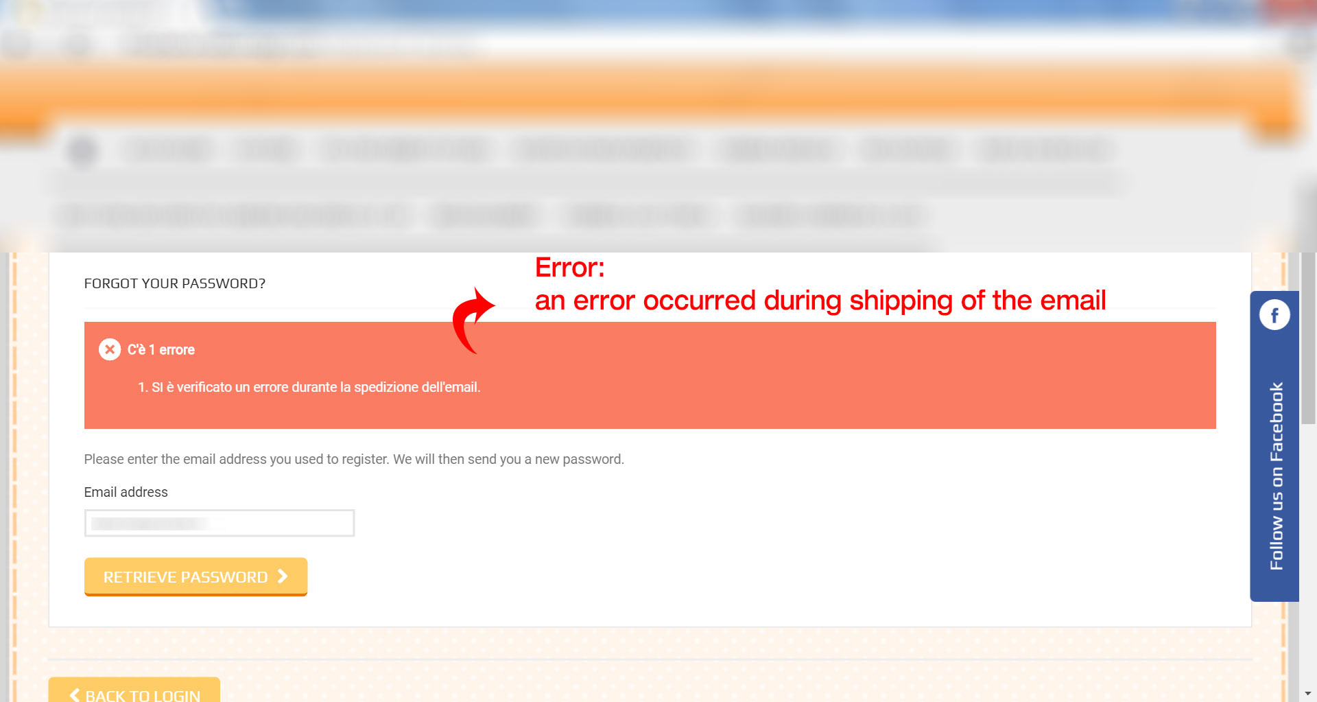 2) After I have selected a product, click on the "Proceed to checkout" and rightly so the system asks me or to register or authenticate me. I type my email and password (user test that are sure to be right) but does not recognize me. Then I click on "Forgot your password" but then I write my email (which esite in the customer list) and clicking "send" but i get this error "An error occurred while sending the email" (attachment 2).