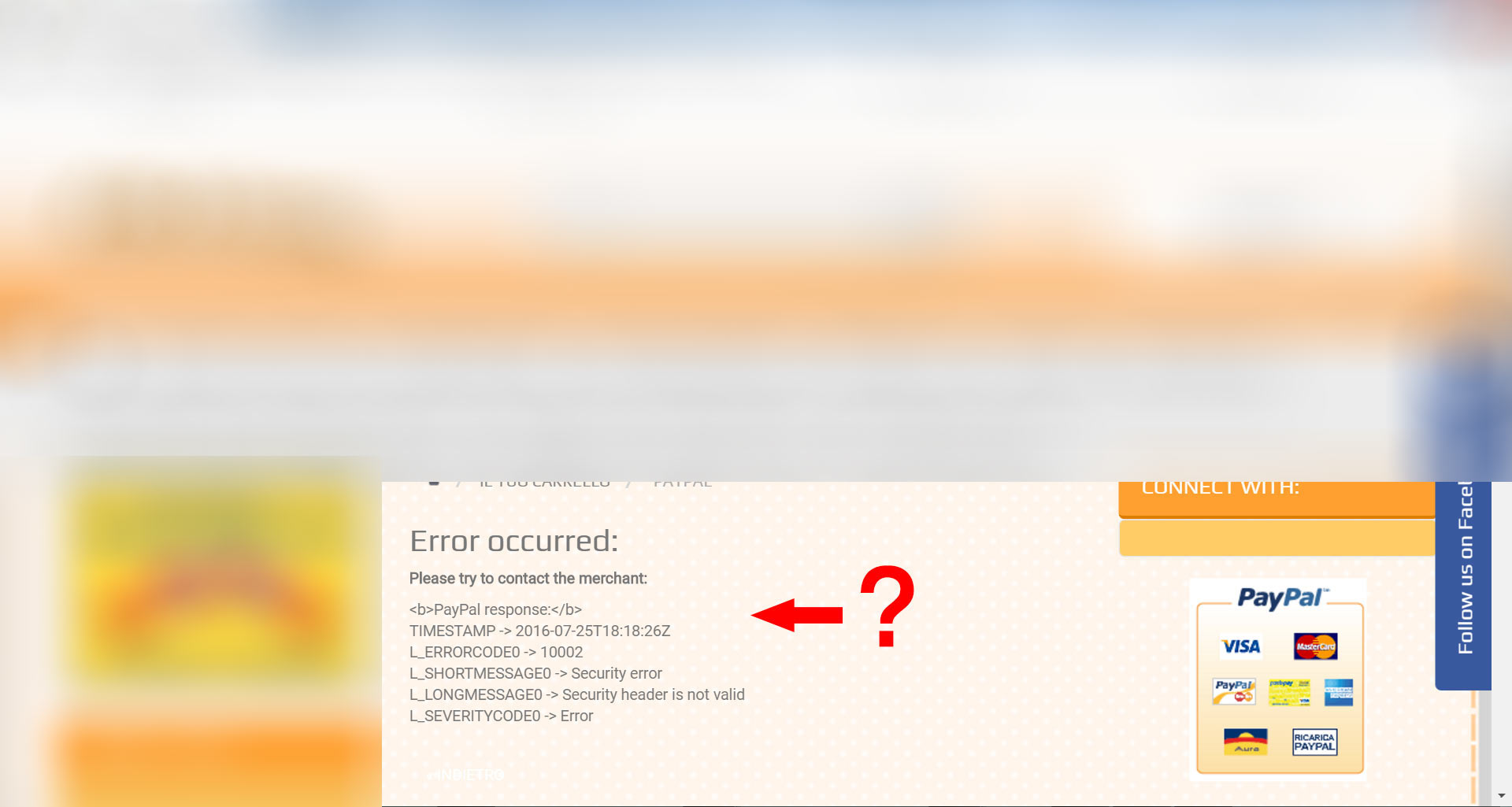 1) After I have selected a product, I try to purchase with credit card so click on image Paypal express for pay and I get this error (attachment 1).