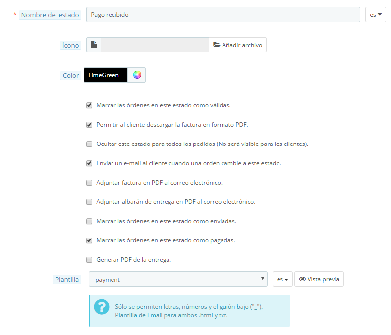 frank1986 Posted July 27, 2016 Author Share Posted July 27, 2016 Gracias por contestar !!! No me queda muy claro. Por ejemplo, cuando yo compro y pago con tarjeta y todo funciona correctamente, el estado se pone a "Pago recibido" y se genera factura, pero al ir a dicho estado y sus opciones, la opción "Generar PDF de la entrega" está desmarcada. Adjunto imagen de lo que digo, a ver que tendría que desactivar... Link to comment Share on other sites More sharing options...