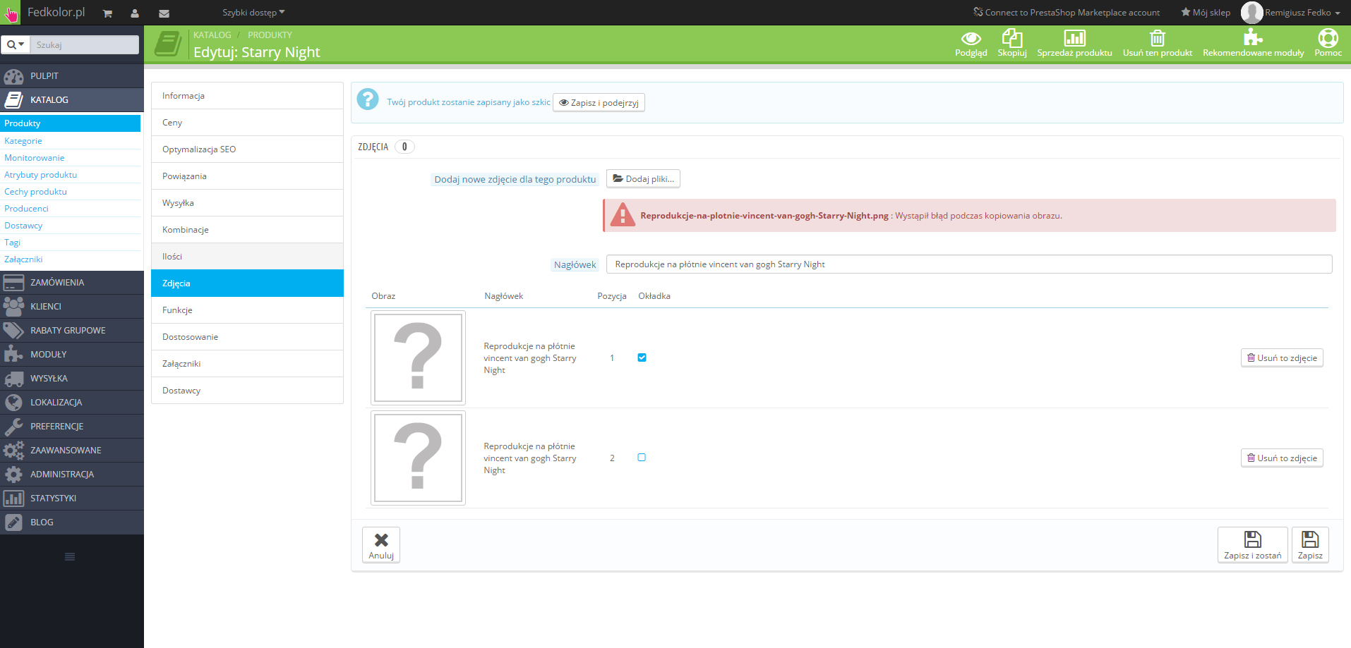 0 Remigiusz Posted August 2, 2016 Author Share Posted August 2, 2016 Teraz mam kolejny problem, bo przy wgrywaniu produktów, nagle wyskakuje błąd podczas wgrywania zdjęć. Jak kopiuje produkt to teraz kopiuje się również bez zdjęcia. Gdy usuwam skopiowany "niedorobiony produkt" niby się on usuwa ale u góry pojawia się wystąpił błąd podczas usuwania. Wie ktoś co to może być i dlaczego tak się dzieje? Z góry dziękuję za pomoc. Link to comment Share on other sites More sharing options...