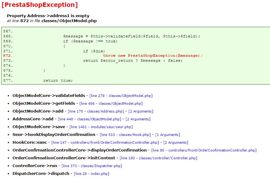 Enrique Gómez Posted August 4, 2016 Share Posted August 4, 2016 Buenas, El problema o error que está devolviendo es que el campo de dirección "address1" está vacío o no existe. ¿Ha comprobado que este campo exista en la base de datos y realmente tenga contenido? en este caso se trata de una validación de prestashop (hace uso de sus validadores antes de meterlo en BBDD) Address1 es un campo obligatorio. Tiene toda la pinta de que es un bug del módulo de seur y deberías ponerte en contacto con ellos Link to comment Share on other sites More sharing options...