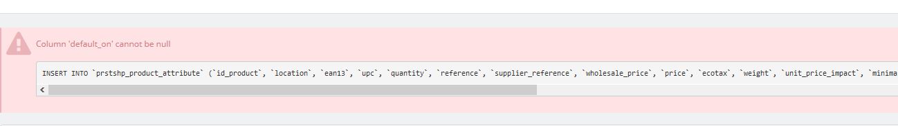 aposi Posted August 8, 2016 Share Posted August 8, 2016 Hola, despues de actualizar a laversion 1.6.1.6, al generar combinaciones me aparece el siguiente error Column 'default_on' cannot be null INSERT INTO `prstshp_product_attribute` (`id_product`, `location`, `ean13`, `upc`, `quantity`, `reference`, `supplier_reference`, `wholesale_price`, `price`, `ecotax`, `weight`, `unit_price_impact`, `minimal_quantity`, `default_on`, `available_date`) VALUES ('1', '', '', '', '0', 'demo_1', '', '0', '0', '0', '0', '0', '1', NULL, '0000-00-00') no me inserta ninguna combinacion y si el producto tenia creada combinaciones solo me aparece una Link to comment Share on other sites More sharing options...