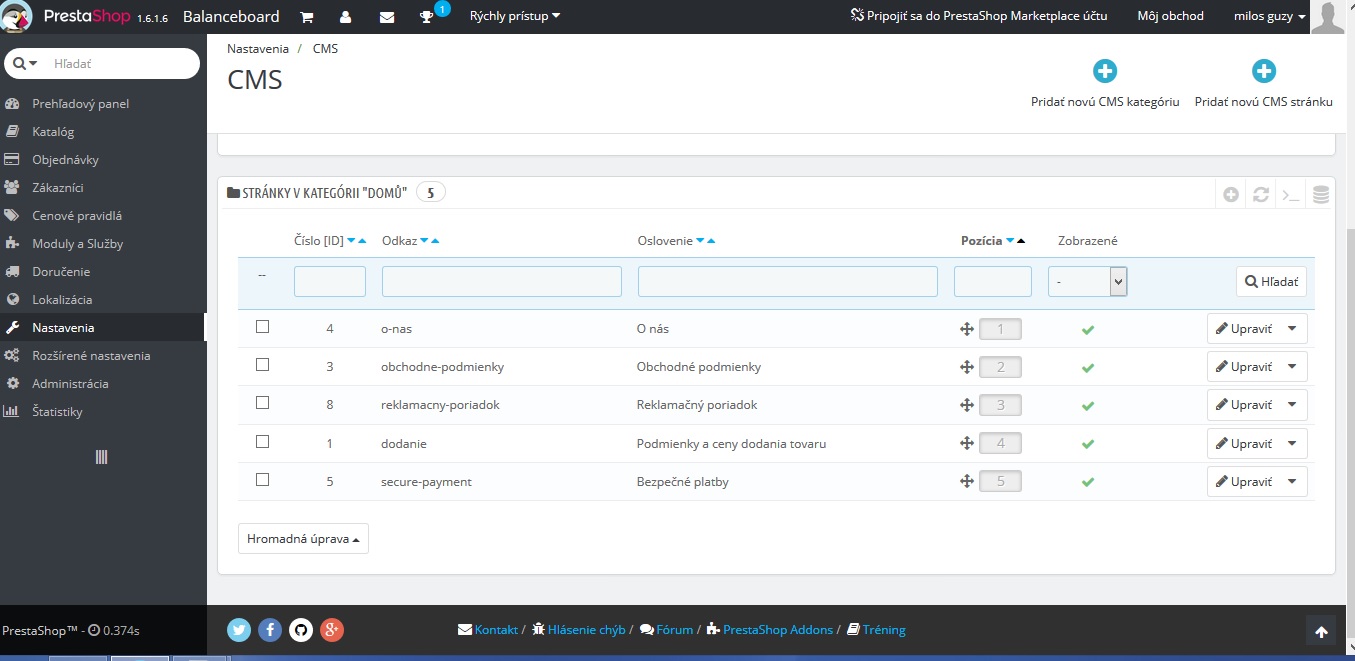milos G Posted August 8, 2016 Share Posted August 8, 2016 Dobrý deň, prosím Vás, neviem si poradiť so zoradením CMS stránok. Na print screene som odfotil, že v nastaveniach mám zoradené CMS stránky, všetky sú zobrazené, ale v e-shope sú v inom poradí a dokonca reklamačný poriadok je nezobrazený (foto 2). Kde by som to vedel nastaviť a zoradiť aby to v e-shope fungovalo? Ďakujem Link to comment Share on other sites More sharing options...