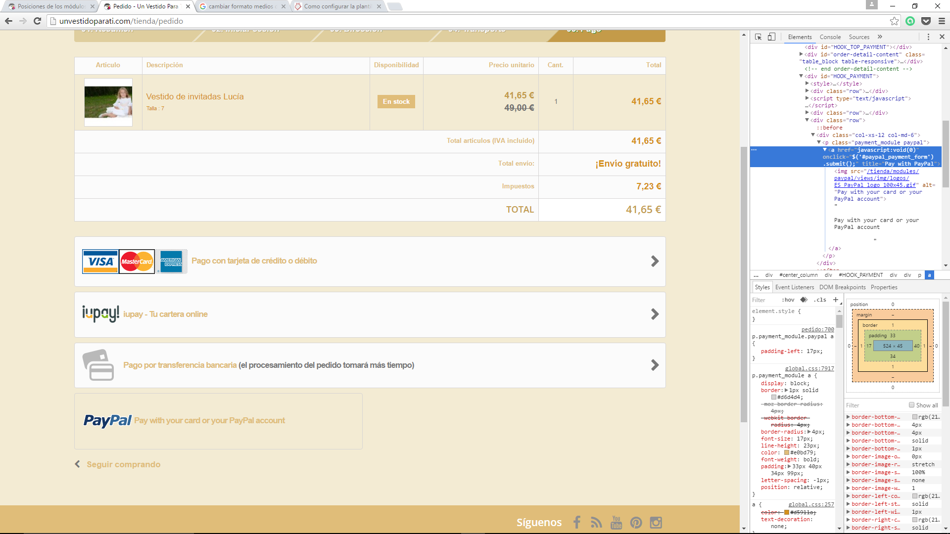 info@unvestidoparati Posted August 8, 2016 Share Posted August 8, 2016 ¡Hola! ¿Alguno sabe cómo cambiar el aspecto del botón de PayPal en el proceso de pago? Inspeccionando con Firefox o con Chrome me dice que el css que le afecta es uno llamado pedido y que está en la raíz, pero ahí no hay ningún css (exactamente dice pedido:700). En realidad lo que quiero es que se vea con el mismo fondo y el mismo tamaño que los botones para pagar con transferencia o con tarjeta. Os pongo un pantallazo. La dirección de la tienda es www.unvestidoparati.com/tienda. ¡Gracias! Link to comment Share on other sites More sharing options...